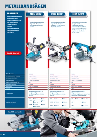 10Handlich und leicht60% schnellere Schnittleistung durch NG Sehr hohe Pr%u00e4zision, extrem laufruhig, Schnittohne Schmierung m%u00f6glich Stufenlose Bandgeschwindigkeit: 30%u201380m / min.Made in ItalyStufenlose Bandgeschwindigkeit: 30%u201380m / min.F%u00fcr bis zu 170 mm Schnittkapazit%u00e4t geeignetStufenlose Bandgeschwindigkeit 23%u201375m / min.Gesch%u00fctzte SpannstockspindelFEATURESIdeal f%u00fcr MontagearbeitenHandlich und leichtEinfach zu transportierenSehr hohe Pr%u00e4zisionExtrem laufruhigPortabelS%u00e4gearm schwenkbarS%u00e4gebandf%u00fchrung mit KugellagernZubeh%u00f6r siehe S.%u200927513460230V/0.45kW23%u201375m/min.1'440%u00d713%u00d70.65mm60%u00b0125mm724%u00d7 375%u00d7446mm19kgBedienungsanleitung D / FL%u00e4ngsanschlagBi-Metall-S%u00e4geband 8/12 Z%u00e4hne/Zoll90%u00b0 125mm 120mm45%u00b0R 70mm 70mm 120%u00d7 70mm60%u00b0 R 35mm 35mm 65%u00d735mm659217230V/1.65kW30%u201380m/min.2'035%u00d7 20%u00d70.9mm60%u00b0170mm1'000%u00d7470%u00d7420mm35kgBedienungsanleitung D / FL%u00e4ngsanschlagBi-Metall-S%u00e4geband 6/10 Z%u00e4hne/Zoll90%u00b0 170mm 166mm45%u00b0R 130mm 130mm60%u00b0 R 75mm 75mm659213230V/1.3kW35%u201380m/min1'440 %u00d7 13 %u00d70.65mm60%u00b0120mm850 %u00d7 830 %u00d7 600mm19kgBedienungsanleitung D / FL%u00e4ngsanschlagBi-Metall-S%u00e4geband 14 Z%u00e4hne/ZollWerkzeuge f%u00fcr Bandwechsel90%u00b0 120mm 120 %u00d7 102mm45%u00b0 78mm60%u00b0 50%u00d743mmArtikelnummerMotorspannung/-leistungBandgeschwindigkeitS%u00e4gebandmassS%u00e4gearm schwenkbar bisSpannstock%u00f6ffnungAbmessungGewichtLieferumfangSchnittkapazit%u00e4tenMETALLBANDS%u00c4GENMBS-100%u2009V MBS-170%u2009V MBS-120%u2009V