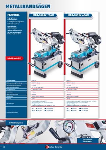 12K%u00fchlmittelsystemSpanndruckmanometerFEATURESKugelgelagerte Bandf%u00fchrungen4 BandgeschwindigkeitenK%u00fchlmittelsystemHydraulischer AbsenkzylinderSpanndruckmanometer24-Volt-Steuerung mit MotorschutzschalterZubeh%u00f6r siehe S.%u200927659219230V/0.75kW0.01kW22, 33, 45, 65m/min2'360%u00d719%u00d70.9mm610mm260mm450%u00d71'200%u00d71'730mm130kgBedienungsanleitung D / FMaschinenstand mit TransportrollenL%u00e4ngsanschlagBi-Metall-S%u00e4geband 6/10 Z%u00e4hne pro Zoll90%u00b0 180mm 165%u00d7280mm45%u00b0R 105mm 110%u00d7180mm659221400V/0.75kW0.01kW22, 33, 45, 65m/min2'360%u00d719%u00d70.9mm610mm260mm450%u00d71'200%u00d71'730mm130kgBedienungsanleitung D / F, Netzstecker 400 V, CEE16Maschinenstand mit TransportrollenL%u00e4ngsanschlagBi-Metall-S%u00e4geband 6/10 Z%u00e4hne pro Zoll90%u00b0 180mm 165%u00d7280mm45%u00b0R 105mm 110%u00d7180mmArtikelnummerMotorspannung/-leistungMotor K%u00fchlwasserpumpeBandgeschwindigkeitS%u00e4gebandmassTischh%u00f6heSpannstock%u00f6ffnungAbmessungGewichtLieferumfangSchnittkapazit%u00e4tenMETALLBANDS%u00c4GENMBS-180SK %u2009230%u2009V MBS-180SK 400%u2009V