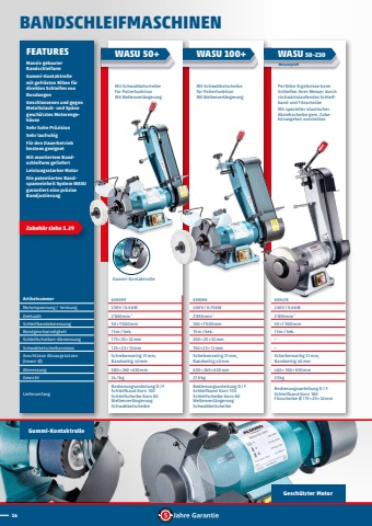 16Gummi-KontaktrolleGesch%u00fctzter MotorPerfekte Ergebnisse beim Schleifen Ihrer Messer durch r%u00fcckw%u00e4rtslaufendes Schleifband und FilzscheibeMit spezieller elastischer Abziehscheibe gem. Zubeh%u00f6rangebot ausr%u00fcstbar.Mit Schwabbelscheibe f%u00fcr PolierfunktionMit Wellenverl%u00e4ngerungMit Schwabbelscheibe f%u00fcr PolierfunktionMit Wellenverl%u00e4ngerungFEATURESMassiv gebauter BandschleifarmGummi-Kontaktrolle mit gefr%u00e4sten Rillen f%u00fcr direktes Schleifen von RundungenGeschlossenes und gegen Metallstaub- und Sp%u00e4ne gesch%u00fctztes Motorengeh%u00e4useSehr hohe Pr%u00e4zisionSehr laufruhigF%u00fcr den Dauerbetrieb bestens geeignetMit montiertem Bandschleifarm geliefert%u00a0Leistungsstarker MotorDie patentierten Bandspanneinheit System WASU garantiert eine pr%u00e4zise BandjustierungZubeh%u00f6r siehe S.%u200929659099230V/0.6kW2'850min-1 50%u00d71'000mm15m/Sek.175%u00d7 25%u00d7 32mm125%u00d723 %u00d7 12mmScheibenseitig 31mm, Bandseitig 40mm580%u00d7 260%u00d7630mm24.1kgBedienungsanleitung D/FSchleifband Korn 100Schleifscheibe Korn 80Wellenverl%u00e4ngerungSchwabbelscheibe659096400V/0.75kW2'850min-1 100%u00d71'000mm15m/Sek.200%u00d725%u00d732mm150%u00d7 23 %u00d7 12mmScheibenseitig 31mm, Bandseitig 40mm630%u00d7 260%u00d7630mm27.6kgBedienungsanleitung D/FSchleifband Korn 100Schleifscheibe Korn 80Wellenverl%u00e4ngerungSchwabbelscheibe659478230V/0.6kW2'850min-1 50%u00d71'000mm15m/Sek.%u2013%u2013Scheibenseitig 31mm, Bandseitig 40mm460%u00d7 350%u00d7650mm23kgBedienungsanleitung D / FSchleifband Korn 180Filzscheibe %u00d8 175%u00d7 25%u00d7 32mmArtikelnummerMotorspannung/-leistungDrehzahlSchleifbandabmessungBandgeschwindigkeitSchleifscheiben-AbmessungSchwabbelscheibenmassAnschl%u00fcsse Absaugstutzen (Innen-%u00d8)AbmessungGewichtLieferumfangBANDSCHLEIFMASCHINENWASU 50+ WASU 100+ WASU 50-230MesserprofiGummi-Kontaktrolle