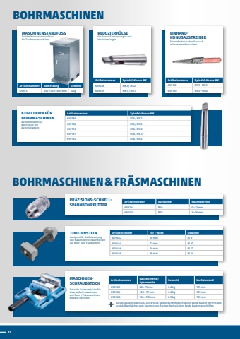 22MASCHINENSCHRAUBSTOCKZubeh%u00f6r Schraubst%u00f6cke f%u00fcr diverse Bohrmaschinenund Bohr-/Fr%u00e4smaschinen Modelle geeignet.T-NUTENSTEINGeeignet f%u00fcr die Befestigung von Maschinenschraubst%u00f6cken auf Bohr- und Fr%u00e4stischenKEGELDORN F%u00dcR BOHRMASCHINENAufnahmedorn f%u00fcr Bohrfutter mit AustreiblappenMASCHINENSTANDFUSSSolider Maschnenstandfuss f%u00fcr TischbohrmaschinenREDUZIERH%u00dcLSEF%u00fcr Konus-Erweiterungen und VerkleinerungenEINHANDKONUSAUSTREIBERF%u00fcr einfaches, schnelles und schonendes AustreibenArtikelnummer Spindel-Konus MK659158 MK1%u2013MK3659160 MK4%u2013MK6Artikelnummer Spindel-Konus MK659268 MK3/MK2659269 MK4/MK3Artikelnummer Abmessung Gewicht659431 550%u00d7350%u00d7850mm 32kgArtikelnummer f%u00fcr T-Nute Gewinde659462 10mm M 8659464 12mm M 10659466 14mm M 12659468 16mm M 14Artikelnummer Backenbreite/Spannweite Gewicht Lochabstand659209 80%u00d7 75mm 3.2kg 115mm659206 100%u00d792mm 4.0kg 125mm659208 120%u00d7110mm 6.5kg 155mmAus massivem Stahlguss, universelle Befestigungsm%u00f6glichkeiten, beide Backen mit Prismen und Auflagefl%u00e4chen zum Spannen von flachen Werkst%u00fccken, beide Backen geschliffenArtikelnummer Spindel-Konus MK659186 B16/MK2659188 B16/MK3659190 B18/MK2659191 B18/MK3659192 B18/MK4PR%u00c4ZISIONS-SCHNELLSPANNBOHRFUTTERArtikelnummer Aufnahme Spannbereich659264 B16 0%u201313mm659265 B18 3%u201316mmBOHRMASCHINEN%u2009&%u2009FR%u00c4SMASCHINENBOHRMASCHINEN