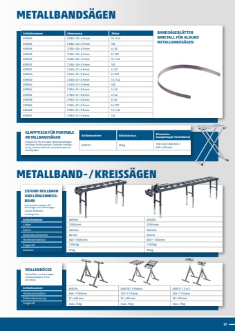 27BANDS%u00c4GEBL%u00c4TTER BIMETALL F%u00dcR ALDURO METALLBANDS%u00c4GENZUFUHR-ROLLBAHNUND L%u00c4NGENMESSBAHNUniversaleinsetzbar f%u00fcr Kreiss%u00e4gen und Bands%u00e4genZufuhr-Rollbahn verl%u00e4ngerbarROLLENB%u00d6CKEBeistellbar an Kreiss%u00e4gen und Bands%u00e4gen, Preis pro St%u00fcck659496 6592052'000mm 3'000mm360mm 360mm60mm 60mm650%u20131'000mm 650%u20131'000mm1'050kg 1'050kg57kg 96kgArtikelnummerL%u00e4ngeBreiteRollendurchmesserH%u00f6henverstellbarTragkraftGewichtArtikelnummer Abmessung Z%u00e4hne659500 2'080%u00d7 20%u00d70.9mm 10/14Z659503 2'080%u00d720%u00d70.9mm 18Z659056 2'360%u00d7 20%u00d70.9mm 4/6Z659059 2'360%u00d7 20%u00d70.9mm 6/10Z659049 2'360%u00d7 20%u00d70.9mm 10/14Z659053 2'360%u00d7 20%u00d70.9mm 18Z659057 2'460%u00d7 27 %u00d70.9mm 4/6Z659060 2'460%u00d727 %u00d70.9mm 6/10Z659050 2'460%u00d7 27 %u00d70.9mm 10/14Z659054 2'460%u00d727 %u00d70.9mm 18Z659504 2'965%u00d7 27 %u00d70.9mm 4/6Z659055 2'965%u00d7 27 %u00d70.9mm 3/4Z659058 2'965%u00d7 27 %u00d70.9mm 5/8Z659506 2'965%u00d727 %u00d70.9mm 6/10Z659498 2'965%u00d7 27 %u00d70.9mm 10/14Z659501 2'965%u00d7 27 %u00d70.9mm 18ZKLAPPTISCH F%u00dcR PORTABLE METALLBANDS%u00c4GENKlapptisch f%u00fcr portable Metallbands%u00e4gen ben%u00f6tigt f%u00fcr Baustellen. Einfache Handhabung, sowie praktisch und platzsparend, da klappbarArtikelnummer Nutzlast max. Dimension (ausgeklappt/Nutzfl%u00e4che)659193 50kg 750%u00d7430%u00d7820mm/650%u00d7420mm659276 659278 | 5 Rollen 659277 | 2 in 1660%u20131'100mm 720%u20131'120mm 700%u20131'170mm57 %u00d7400mm 57%u00d7400mm 38%u00d7 355mmmax. 75kg max. 75kg max. 75kgArtikelnummerH%u00f6henverstellbarRollenabmessungTragkraftMETALLBANDS%u00c4GENMETALLBAND-%u2009/%u2009KREISS%u00c4GEN