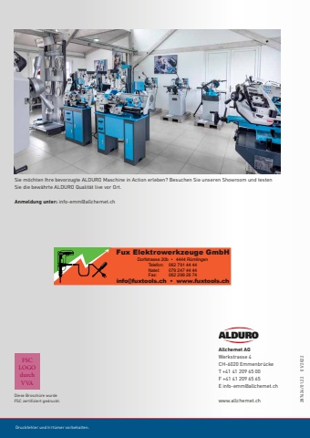 Diese Brosch%u00fcre wurde FSC zertifiziert gedruckt. FSC LOGOdurchVVAAllchemet AGWerkstrasse 4CH-6020 Emmenbr%u00fcckeT +41 41 209 65 00F +41 41 209 65 65E info-emm@allchemet.chwww.allchemet.chALDURODruckfehler und Irrt%u00fcmer vorbehalten.287624/01.22 01/2022Sie m%u00f6chten Ihre bevorzugte ALDURO Maschine in Action erleben? Besuchen Sie unseren Showroom und testen Sie die bew%u00e4hrte ALDURO Qualit%u00e4t live vor Ort.Anmeldung unter: info-emm@allchemet.chFux Elektrowerkzeuge GmbHinfo@fuxtools.ch %u2022 www.fuxtools.chDorfstrasse 20b %u2022 4444 R%u00fcmlingen062 791 44 44079 247 44 44062 299 26 74Telefon:Natel:Fax: