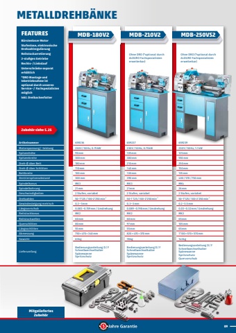 09MitgeliefertesZubeh%u00f6rOhne DRO (*optional durch ALDURO Fachspezialisten erweiterbar)Ohne DRO (*optional durch ALDURO Fachspezialisten erweiterbar)FEATURESB%u00fcrstenloser MotorStufenlose, elektronische DrehzahlregulierungReitstockarretierung 2-stufiges GetriebeRechts-/LinkslaufUnterschr%u00e4nke separat erh%u00e4ltlich*DRO Montage und Inbetriebnahme ist optional durch unseren Service-/ Fachspezialisten m%u00f6glich Inkl. DreibackenfutterZubeh%u00f6r siehe S.%u200925659236230V/50Hz, 0.75kW90mm300mm180mm110mm100mm300 mmMK321mm2 Stufen, variabel50-1'125/100-2'250min-1 0.3%u20133mm0.083%u20130.159mm/UmdrehungMK260mm80mm55mm750%u00d7 470%u00d7 340mm63kgBedienungsanleitung D/FSchnellwechselhalterSp%u00e4newanneSpritzschutz659237230V/50Hz, 0.75kW105mm380mm210mm140mm100mm390 mmMK321mm2 Stufen, variabel50-1'125/100-2'250min-1 0.3%u20133mm0.089%u20130.198mm/UmdrehungMK260mm97mm55mm820%u00d7 470%u00d7 370mm78kgBedienungsanleitung D/FSchnellwechselhalter Sp%u00e4newanneSpritzschutz659239230V/50Hz, 1.1kW125mm550mm250mm150mm135mm400/570/750mmMK426mm2 Stufen, variabel50-1'125/100-2'250min-1 0.2%u20133.5mm0.03%u20130.32mm/UmdrehungMK265mm105mm65mm1'100%u00d7 570%u00d7 570mm143kgBedienungsanleitung D/FSchnellwechselhalterSp%u00e4newanneSpritzschutzQuervorschubArtikelnummerMotorspannung/-leistungSpitzenh%u00f6heSpitzenbreiteDreh-%u00d8 %u00fcber BettDreh-%u00d8 %u00fcber SchlittenBettbreiteZentrierspitzenabstandSpindelkonusSpindelbohrungGeschwindigkeitenDrehzahlenGewindesteigung metrischL%u00e4ngsvorschubReitstockkonusReitstockwellenQuerschlittenL%u00e4ngsschlittenAbmessungGewichtLieferumfangMETALLDREHB%u00c4NKEMDB-180V2 MDB-210V2 MDB-250VS2