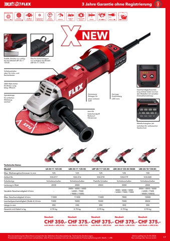 Die Ausstattung der Maschinen entspricht der %u00fcblichen Grundausstattung. Technische %u00c4nderungen, Preis%u00e4nderungen und Irrtum vorbehalten. Alle Preise verstehen sich als unverbindliche Preisempfehlung exkl. MwSt. + vRB. 17 Aktion g%u00fcltig bis 31.03.2026Nur solange der Vorrat reicht3 Jahre Garantie ohne RegistrierungTechnische DatenModell LB 20-11 125-EC LBE 20-11 125-EC LBP 20-11 125-EC LBE 20-8 125-EC INOX LBE 20-10 150-ECMax. Werkzeugdurchmesser in mm 125 125 125 125 150Artikel-Nr. 534.017 534.016 534.018 534.019 534.020Schaltertyp Schiebeschalter Schiebeschalter Paddle-Schalter Schiebeschalter SchiebeschalterLeistung in Watt 2000 2000 2000 2000 2000Variable Geschwindigkeit U/min %u20133000 / 4000 / 5000 / 6000 / 7500 / 9400 (11000)%u2013 3000 / 4000 / 5000 / 6000 / 7000 / 78003000 / 4000 / 5000 / 6000 / 7500 / 8500 (10000)Max. Geschwindigkeit U/min. 11000 11000 11000 7800 10000Leerlaufgeschwindigkeit (Stufe 6) U/min 9400 9400 9400 7500 8500L%u00e4nge in mm 350 350 350 350 350Gewicht mit Kabel in kg 2.75 kg 2.75 kg 2.75 kg 2.75 kg 2.75 kgGeschwindigkeitsverstellung mittels Tasten (nur bei den Modellen mit variabler Drehzahleinstellung)Paddle-Schalter nur verf%u00fcgbar bei Modell LBP 20-11 125-ECMetallschutzgitter (abnehmbar) f%u00fcr verbesserten Staubschutz%u00d6se f%u00fcr Sicherheitsgurt nur verf%u00fcgbar bei Modell LBP 20-11 125-ECAnti-Vib SeitenhandgriffReduziert VibrationenSchiebeschalter oben f%u00fcr Links- und Rechtsh%u00e4nderGeringer Greifumfang (205 mm)Spindelstopp f%u00fcr einfachen WerkzeugwechselGummierte Einlagen f%u00fcr einen sicheren Griff2000 Watt starker EC-Motor. Langlebig. Effizient.NeuheitCHF 350.%u2013exkl. MwSt. + vRB (0.56)NeuheitCHF 375.%u2013exkl. MwSt. + vRB (0.56)NeuheitCHF 375.%u2013exkl. MwSt. + vRB (0.56)NeuheitCHF 375.%u2013exkl. MwSt. + vRB (0.56)NeuheitCHF 375.%u2013exkl. MwSt. + vRB (0.56)
