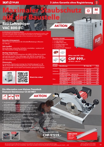 Die Ausstattung der Maschinen entspricht der %u00fcblichen Grundausstattung. Technische %u00c4nderungen, Preis%u00e4nderungen und Irrtum vorbehalten. Alle Preise verstehen sich als unverbindliche Preisempfehlung exkl. MwSt. + vRB. 23 Aktion g%u00fcltig bis 31.03.2026Nur solange der Vorrat reicht3 Jahre Garantie ohne RegistrierungDie Alternative zum kleinen Trenntisch Diamant-Steintrenner CS 60 WET%u0083 Hochleistungsmotor: extra stark zum Steinschneiden und Fugenfr%u00e4sen%u0083 Stufenlose Schnitttiefeneinstellung von 0-60 mm, mit F%u00fchrungsschiene bis 54 mm. Im Gehrungsschnitt von 0-44 mm, mit F%u00fchrungsschiene bis 38 mm%u0083 Stufenlose Winkeleinstellung f%u00fcr Gehrungsschnitte von 0-45%u00b0%u0083 Schnittmarkierung am F%u00fchrungsstisch von 0%u00b0/30%u00b0/45%u00b0 f%u00fcr eine schnelle Orientierung%u0083 Hochwertige Schutzhaube und F%u00fchrungsplatte aus Magnesium-Druckguss%u0083 Motorschutz aus Gummi verhindert das direkte Ansaugen von Spritzwasser%u0083 Wasserzufuhr: f%u00fcr eine wirkungsvolle K%u00fchlung des Diamant-Werkzeuges%u0083 Schnellkupplung aus Messing: f%u00fcr 1/2\%u0083 PRCD-Personenschutzschalter: im Kabel integriertPRCD INKLUSIVEGRS 160 F%u00fchrungsschieneBestell-Nr. 531.029%u0083 1x Diamant-Steintrenner CS 60 WET%u0083 1x Schl%u00fcssel f%u00fcr Werkzeugwechsel%u0083 1x Parallelanschlag%u0083 1x Transportkoffer L-BOXX%u00ae 238%u0083 1x Diamanttrennscheibe mit segmentiertem SchneidrandAktion statt CHF 1%u2019310.%u2013CHF 1%u2019119.%u2013exkl. MwSt. + vRB. (0.56)Maximaler Staubschutz auf der BaustelleBau-Luftreiniger VAC 800-ECIm Arbeitsbereich mit Unterdruck arbeitenUm zu vermeiden, dass St%u00e4ube in die Umgebung au%u00dferhalb des Arbeitsbereichs wandern, sollte eine Schleuse installiert werden. Die gereinigte Luft wird dabei aus den Arbeitsbereich mittels%u00a0 Schlauch ausgeleitet oder als gereinigte Luft dem Arbeitsbereich wieder zugef%u00fchrt.Besonders leistungsstarkSenkt in kurzer Zeit deutlich die Schadstoffbelastung in R%u00e4umen bis 100 qm.Sehr handlichKeine Montage notwendig. Aufstellen, einschalten %u2013 saubere Luft. Der Filterwechsel erfolgt werkzeuglos.Niedrige NebenkostenBei sachgem%u00e4%u00dfer Anwendung kann der HEPA 14 Filter bis zu einem Jahr genutzt werden. Der Luftreiniger VAC 800-EC ist speziell f%u00fcr den Dauerbetrieb ausgelegt und %u00fcberzeugt durch einen sehr geringen Stromverbrauch.Fl%u00fcstermodusIm speziellen Nachtmodus betr%u00e4gt der Schalldruckpegel nur 38 dB (A). Damit f%u00e4llt das Betriebsger%u00e4usch unter die Konzentrationsst%u00f6rungsschwelle und ist damit auch bestens geeignet f%u00fcr Klassenzimmer u.%u00c4.Watch the video!Zubeh%u00f6rProdukt Bezeichnung VE Best.-Nr. Preis exkl. MwSt.Schl%u00e4ucheSH 125x5m C 1 477.672 78.%u2013SH 125x6m C 1 488.186 92.%u2013SH 205x7,5m C 1 500.399 184.%u2013FilterVorfiltermatten G3 VFE VAC G3 10 477.699 35.%u2013Grobfilter G4 FE VAC G4 1 477.702 34.%u2013Aktivkohlefilter G4 FE VAC G4 AK 1 477.710 76.%u2013Feinstaubfilter F7 FE VAC F7 1 477.729 58.%u2013Filter HEPA 13 FE VAC H13/HEPA 1 477.737 215.%u2013Filter HEPA 14 FE VAC H14/HEPA 1 488.194 231.%u2013Bestell-Nr. 532.859%u0083 1x VAC 800-EC%u0083 1x HEPA Filter H14%u0083 1x Vorfiltermatten G3%u0083 1x Grobfilter G4%u0083 1x Schlauch SH 125x5m CAktion statt CHF 1%u2019265.%u2013CHF 999.%u2013exkl. MwSt. + vRB (2.31)