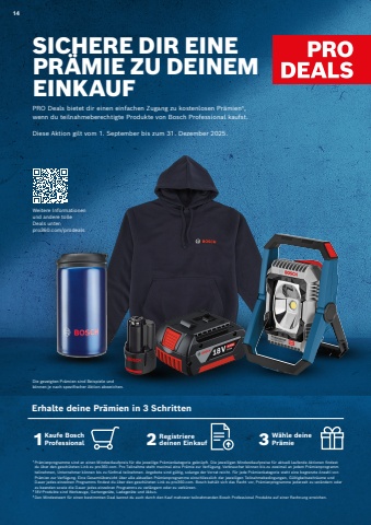 %u00b9%u2009Pr%u00e4mienprogramme sind an einen Mindestkaufpreis f%u00fcr die jeweilige Pr%u00e4mienkategorie gekn%u00fcpft. Die jeweiligen Mindestkaufpreise f%u00fcr aktuell laufende Aktionen findest du %u00fcber den gesch%u00fctzten Link zu pro360.com. Pro Teilnahme steht maximal eine Pr%u00e4mie zur Verf%u00fcgung. Verbraucher k%u00f6nnen bis zu zweimal an jedem Pr%u00e4mienprogramm teilnehmen, Unternehmer k%u00f6nnen bis zu f%u00fcnfmal teilnehmen. Angebote sind g%u00fcltig, solange der Vorrat reicht. F%u00fcr jede Pr%u00e4mienkategorie steht eine begrenzte Anzahl von Pr%u00e4mien zur Verf%u00fcgung. Eine Gesamt%u00fcbersicht %u00fcber alle aktuellen Pr%u00e4mienprogramme einschliesslich der jeweiligen Teilnahmebedingungen, G%u00fcltigkeitszeitr%u00e4ume und Dauer jedes einzelnen Programms findest du %u00fcber den gesch%u00fctzten Link zu pro360.com. Bosch beh%u00e4lt sich das Recht vor, Pr%u00e4mienprogramme jederzeit zu ver%u00e4ndern oder zu beenden sowie die Dauer jedes einzelnen Programms zu verl%u00e4ngern oder zu verk%u00fcrzen.%u00b2 18V-Produkte sind Werkzeuge, Gartenger%u00e4te, Ladeger%u00e4te und Akkus.%u00b3%u2009Den Mindestwert f%u00fcr einen bestimmten Deal kannst du auch durch den Kauf mehrerer teilnehmenden Bosch Professional Produkte auf einer Rechnung erreichen.Weitere Informationen und andere tolle Deals unter: pro360.com/prodealsSICHERE DIR EINE PR%u00c4MIE ZU DEINEM EINKAUFPRO Deals bietet dir einen einfachen Zugang zu kostenlosen Pr%u00e4mien1, wenn du teilnahmeberechtigte Produkte von Bosch Professional kaufst.Diese Aktion gilt vom 1. September bis zum 31. Dezember 2025.Erhalte deine Pr%u00e4mien in 3 SchrittenKaufe Bosch 1 ProfessionalRegistriere 2 deinen EinkaufW%u00e4hle deine 3 Pr%u00e4mieDie gezeigten Pr%u00e4mien sind Beispiele und k%u00f6nnen je nach spezifischer Aktion abweichen.14