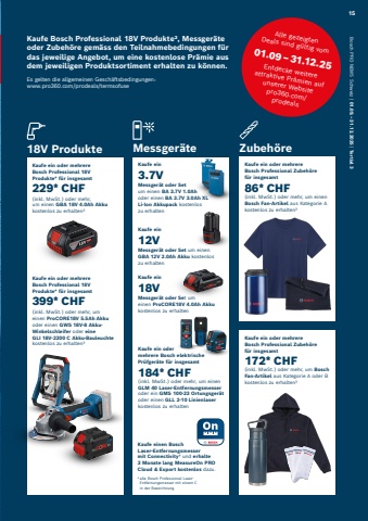Kaufe ein oder mehrere Bosch elektrische Pr%u00fcfger%u00e4te f%u00fcr insgesamt 184* CHF (inkl. MwSt.) oder mehr, um einen GLM 40 Laser-Entfernungsmesseroder ein GMS 100-23 Ortungsger%u00e4toder einen GLL 2-10 Linienlaserkostenlos zu erhaltenKaufe einen Bosch Laser-Entfernungsmesser mit Connectivity4 und erhalte 3 Monate lang MeasureOn PRO Cloud & Export kostenlos dazu.4%u2009alle Bosch Professional LaserEntfernungsmesser mit einem C in der BezeichnungKaufe ein oder mehrere Bosch Professional 18V Produkte* f%u00fcr insgesamt 229* CHF(inkl. MwSt.) oder mehr, um einen GBA 18V 4.0Ah Akkukostenlos zu erhalten3Kaufe ein 3.7V Messger%u00e4t oder Set um einen BA%u00a03.7V%u00a01.0Ah oder einen BA%u00a03.7V%u00a03.0Ah%u00a0XL Li-Ion Akkupack kostenlos zu erhaltenKaufe ein 18V Messger%u00e4t oder Set um einen ProCORE18V%u00a04.0Ah Akku kostenlos zu erhaltenKaufe ein12V Messger%u00e4t oder Set um einen GBA%u00a012V%u00a02.0Ah Akku kostenlos zu erhaltenKaufe ein oder mehrere Bosch Professional Zubeh%u00f6re f%u00fcr insgesamt86* CHF (inkl. MwSt.) oder mehr, um einen Bosch Fan-Artikel aus Kategorie%u00a0A kostenlos zu erhalten318V ProdukteKaufe ein oder mehrere Bosch Professional 18V Produkte* f%u00fcr insgesamt399* CHF(inkl. MwSt.) oder mehr, um einen ProCORE18V%u00a05.5Ah Akkuoder einen GWS%u00a018V-8 AkkuWinkelschleifer oder eine GLI%u00a018V-2200 C Akku-Bauleuchte kostenlos zu erhalten3Kaufe Bosch Professional 18V Produkte2, Messger%u00e4te oder Zubeh%u00f6re gem%u00e4ss den Teilnahmebedingungen f%u00fcr das jeweilige Angebot, um eine kostenlose Pr%u00e4mie aus dem jeweiligen Produktsortiment erhalten zu k%u00f6nnen.Es gelten die allgemeinen Gesch%u00e4ftsbedingungen: www.pro360.com/prodeals/termsofuseMessger%u00e4te Zubeh%u00f6reKaufe ein oder mehrere Bosch Professional Zubeh%u00f6re f%u00fcr insgesamt172* CHF (inkl. MwSt.) oder mehr, um Bosch Fan-Artikel aus Kategorie A oder B kostenlos zu erhalten3Alle gezeigten Deals sind g%u00fcltig vom 01.09%u2009%u2013%u200931.12.25Entdecke weitere attraktive Pr%u00e4mien auf unserer Website pro360.com/prodeals15Bosch PRO NEWS Schweiz | 01.09.%u2009%u2013%u200931.12.2025 | Tertial 3