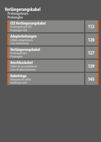 CEE Verl%u00e4ngerungskabelProlongateurs CEE Prolonghe CEE112AdapterleitungenC%u00e2bles adaptateurs Cavi adattatoris120Verl%u00e4ngerungskabelProlongateurs Prolonghe127AnschlusskabelC%u00e2ble de raccordement Cavo di allacciamento139KabelringeAnneaux de c%u00e2ble Anelli per cavi145ProlongateursVerl%u00e4ngerungskabelProlonghe