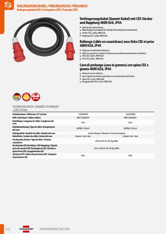 112 WWW.BRENNENSTUHL.COMVERL%u00c4NGERUNGSKABEL/PROLONGATEURS/PROLUNGHEVerl%u00e4ngerungskabel (CEE)/ Prolongateurs (CEE)/ Prolonghe (CEE)VERL%u00c4NGERUNGSKABEL/PROLONGATEURS/PROLUNGHEVerl%u00e4ngerungskabel (CEE)/ Prolongateurs (CEE)/ Prolonghe (CEE)Verl%u00e4ngerungskabel (Gummi-Kabel) mit CEE-Stecker und Kupplung 400V/63A, IP44%u25a0 Ideal f%u00fcr den harten Einsatz.%u25a0 %u00d6lbest%u00e4ndiges Gummikabel f%u00fcr st%u00e4ndige Verwendung im Aussenbereich.%u25a0 Stecker CEE 5-polig, 400V/63A.%u25a0 Kupplung CEE 5-polig, 400V/63A.Rallonge (c%u00e2ble en caoutchouc) avec fiche CEE et prise 400V/63A, IP44%u25a0 Id%u00e9al pour les utilisations intensives.%u25a0 C%u00e2ble en caoutchouc r%u00e9sistant %u00e0 l%u2019huile pour une utilisation permanente %u00e0 l%u2019ext%u00e9rieur.%u25a0 Fiche CEE 5 p%u00f4les, 400V/63A.%u25a0 Prise CEE 5 p%u00f4les, 400V/63A.Cavo di prolunga (cavo in gomma) con spina CEE e giunto 400V/63A, IP44%u25a0 Ideale per un uso intensivo.%u25a0 Cavo in gomma resistente agli olii per un uso permanente all%u2019esterno.%u25a0 Spina CEE a 5 poli, 400V/63A.%u25a0 Accoppiamento CEE a 5 poli, 400V/63A.ROBUSTSPECIALIP44TECHNISCHE DATEN / DONN%u00c9ES TECHNIQUES / DATI TECNICIArtikelnummer/ R%u00e9f%u00e9rence / N%u00b0 articolo 1167630100 1167630200EAN/ Code-barre / Codice a Barre 4007123664634 4007123664641Kabell%u00e4nge / Longueur de c%u00e2ble / Lunghezza del cavo10 m 20 mKabelbezeichnung / Type de c%u00e2ble / Designazione del cavo H07RN-F 5G16,0 H07RN-F 5G16,0Kabelqualit%u00e4t/ Qualit%u00e9 du c%u00e2ble / Qualit%u00e0 del cavo Gummi-Neopren / N%u00e9opr%u00e8ne/ Gomma-NeopreneKabelfarbe / Couleur du c%u00e2ble / Colore del cavo schwarz/ noir/ nero schwarz/ noir/ neroStecksystem Stecker/ Type de fiche / Sistema connettore CEE 63A 3P+N+PE (5p) 400VStecksystem CEE-Steckdose/ CEE-Kupplung / Type de prise de courant CEE/ Prolongateur CEE/ Sistema a spina Presa CEE/ accoppiamento CEECEE 1x 63A 3P+N+PE (5p) 400VSchutzart (IP)/ Indice de protection (IP)/ Categoria di protezione (IP) IP44 IP44