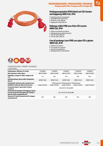 WWW.BRENNENSTUHL.COM 113VERL%u00c4NGERUNGSKABEL/PROLONGATEURS/PROLUNGHEVerl%u00e4ngerungskabel (CEE)/ Prolongateurs (CEE)/ Prolonghe (CEE)VERL%u00c4NGERUNGSKABEL/PROLONGATEURS/PROLUNGHEVerl%u00e4ngerungskabel (CEE)/ Prolongateurs (CEE)/ Prolonghe (CEE)Verl%u00e4ngerungskabel (PUR-Kabel) mit CEE-Stecker und Kupplung 400V/32A, IP44%u25a0 Ideal f%u00fcr den Einsatz im Aussenbereich. %u25a0 Spezialkabel f%u00fcr den harten Einsatz. %u25a0 Stecker CEE 5-polig, 400V/32A.%u25a0 Kupplung CEE 5-polig, 400V/32A.Rallonge (c%u00e2ble PUR) avec fiche CEE et prise 400V/32A, IP44%u25a0 Id%u00e9al pour une utilisation en ext%u00e9rieur. %u25a0 C%u00e2ble sp%u00e9cial pour une utilisation intensive. %u25a0 Fiche CEE 5 p%u00f4les, 400V/32A.%u25a0 Prise CEE 5 p%u00f4les, 400V/32A.Cavo di prolunga (cavo PUR) con spina CEE e giunto 400V/32A, IP44%u25a0 Ideale per l%u2019uso all%u2019aperto. %u25a0 Cavo speciale per uso intensivo. %u25a0 Spina CEE a 5 poli, 400V/32A.%u25a0 Accoppiamento CEE a 5 poli, 400V/32A.ROBUSTSPECIALIP44TECHNISCHE DATEN / DONN%u00c9ES TECHNIQUES / DATI TECNICIArtikelnummer/ R%u00e9f%u00e9rence / N%u00b0 articolo 1161980505 1161980510 1161980515 1161980520 1161980530EAN/ Code-barre / Codice a Barre 4007123310999 4007123311002 4007123311019 4007123311026 4007123311040Kabell%u00e4nge / Longueur de c%u00e2ble / Lunghezza del cavo5 m 10 m 15 m 20 m 30 mKabelbezeichnung / Type de c%u00e2ble / Designazione del cavo H07BQ-F 5G4,0 H07BQ-F 5G4,0 H07BQ-F 5G4,0 H07BQ-F 5G4,0 H07BQ-F 5G4,0Kabelqualit%u00e4t/ Qualit%u00e9 du c%u00e2ble / Qualit%u00e0 del cavo PUR (Polyurethan)/ PUR (polyur%u00e9thane)/ PUR (poliuretano)Kabelfarbe / Couleur du c%u00e2ble / Colore del cavo orange/ arancione orange/ arancione orange/ arancione orange/ arancione orange/ arancioneStecksystem Stecker/ Type de fiche / Sistema connettore CEE 32A 3P+N+PE (5p) 400VStecksystem CEE-Steckdose/ CEE-Kupplung / Type de prise de courant CEE/ Prolongateur CEE/ Sistema a spina Presa CEE/ accoppiamento CEECEE 1x 32A 3P+N+PE (5p) 400VSchutzart (IP)/ Indice de protection (IP)/ Categoria di protezione (IP) IP44 IP44 IP44 IP44 IP44
