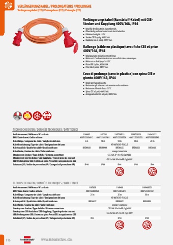 116 WWW.BRENNENSTUHL.COMVERL%u00c4NGERUNGSKABEL/PROLONGATEURS/PROLUNGHEVerl%u00e4ngerungskabel (CEE)/ Prolongateurs (CEE)/ Prolonghe (CEE)VERL%u00c4NGERUNGSKABEL/PROLONGATEURS/PROLUNGHEVerl%u00e4ngerungskabel (CEE)/ Prolongateurs (CEE)/ Prolonghe (CEE)Verl%u00e4ngerungskabel (Kunststoff-Kabel) mit CEEStecker und Kupplung 400V/16A, IP44%u25a0 Ideal f%u00fcr den Einsatz im Aussenbereich. %u25a0 %u00d6lbest%u00e4ndig und mechanisch sehr hoch belastbar.%u25a0 K%u00e4ltebest%u00e4ndig bis -35%u00b0C.%u25a0 Stecker CEE 5-polig, 400V/16A.%u25a0 Kupplung CEE 5-polig, 400V/16A.Rallonge (c%u00e2ble en plastique) avec fiche CEE et prise 400V/16A, IP44%u25a0 Id%u00e9al pour une utilisation en ext%u00e9rieur. %u25a0 R%u00e9sistant %u00e0 l%u2019huile et tr%u00e8s r%u00e9sistant aux sollicitations m%u00e9caniques.%u25a0 R%u00e9sistant au froid jusqu%u2019%u00e0 -35%u00b0C.%u25a0 Fiche CEE 5 p%u00f4les, 400V/16A.%u25a0 Prise CEE 5 p%u00f4les, 400V/16A.Cavo di prolunga (cavo in plastica) con spina CEE e giunto 400V/16A, IP44%u25a0 Ideale per l%u2019uso all%u2019aperto. %u25a0 Resistente agli oli e meccanicamente molto resistente.%u25a0 Resistente al freddo fino a -35%u00b0C.%u25a0 Spina CEE a 5 poli, 400V/16A.%u25a0 Accoppiamento CEE a 5 poli, 400V/16A.ROBUSTSPECIALIP44TECHNISCHE DATEN / DONN%u00c9ES TECHNIQUES / DATI TECNICIArtikelnummer/ R%u00e9f%u00e9rence / N%u00b0 articolo 1166602 1167748 1167748321 1166728320 1169458321EAN/ Code-barre / Codice a Barre 4007123036912 4007123037001 4007123303526 4007123303533 4007123303540Kabell%u00e4nge / Longueur de c%u00e2ble / Lunghezza del cavo 5 m 10 m 10 m 20 m 20 mKabelbezeichnung / Type de c%u00e2ble / Designazione del cavo AT-N07V3V3-F 5G2,5Kabelqualit%u00e4t/ Qualit%u00e9 du c%u00e2ble / Qualit%u00e0 del cavo BREMAXX BREMAXX BREMAXX BREMAXX BREMAXXKabelfarbe / Couleur du c%u00e2ble / Colore del cavo orange/ arancioneStecksystem Stecker/ Type de fiche / Sistema connettore CEE 16A 3P+N+PE (5p) 400VStecksystem CEE-Steckdose/ CEE-Kupplung / Type de prise de courant CEE/ Prolongateur CEE/ Sistema a spina Presa CEE/ accoppiamento CEE CEE 1x 16A 3P+N+PE (5p) 400VSchutzart (IP)/ Indice de protection (IP)/ Categoria di protezione (IP) IP44 IP44 IP44 IP44 IP44TECHNISCHE DATEN / DONN%u00c9ES TECHNIQUES / DATI TECNICIArtikelnummer/ R%u00e9f%u00e9rence / N%u00b0 articolo 1167628 1169488 1169468321EAN/ Code-barre / Codice a Barre 4007123039159 4007123042814 4007123303182Kabell%u00e4nge / Longueur de c%u00e2ble / Lunghezza del cavo 25 m 25 m 30 mKabelbezeichnung / Type de c%u00e2ble / Designazione del cavo AT-N07V3V3-F 5G2,5Kabelqualit%u00e4t/ Qualit%u00e9 du c%u00e2ble / Qualit%u00e0 del cavo BREMAXX BREMAXX BREMAXXKabelfarbe / Couleur du c%u00e2ble / Colore del cavo orange/ arancioneStecksystem Stecker/ Type de fiche / Sistema connettore CEE 16A 3P+N+PE (5p) 400VStecksystem CEE-Steckdose/ CEE-Kupplung / Type de prise de courant CEE/ Prolongateur CEE/ Sistema a spina Presa CEE/ accoppiamento CEE CEE 1x 16A 3P+N+PE (5p) 400VSchutzart (IP)/ Indice de protection (IP)/ Categoria di protezione (IP) IP44 IP44 IP44