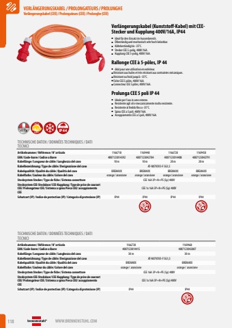 118 WWW.BRENNENSTUHL.COMVERL%u00c4NGERUNGSKABEL/PROLONGATEURS/PROLUNGHEVerl%u00e4ngerungskabel (CEE)/ Prolongateurs (CEE)/ Prolonghe (CEE)VERL%u00c4NGERUNGSKABEL/PROLONGATEURS/PROLUNGHEVerl%u00e4ngerungskabel (CEE)/ Prolongateurs (CEE)/ Prolonghe (CEE)Verl%u00e4ngerungskabel (Kunststoff-Kabel) mit CEEStecker und Kupplung 400V/16A, IP44%u25a0 Ideal f%u00fcr den Einsatz im Aussenbereich. %u25a0 %u00d6lbest%u00e4ndig und mechanisch sehr hoch belastbar.%u25a0 K%u00e4ltebest%u00e4ndig bis -35%u00b0C.%u25a0 Stecker CEE 5-polig, 400V/16A.%u25a0 Kupplung CEE 5-polig, 400V/16A.Rallonge CEE %u00e0 5-p%u00f4les, IP 44%u25a0 d%u00e9al pour une utilisation en ext%u00e9rieur. %u25a0 R%u00e9sistant aux huiles et tr%u00e8s r%u00e9sistant aux contraintes m%u00e9caniques.%u25a0 R%u00e9sistant au froid jusqu%u2019%u00e0 -35%u00b0C.%u25a0 Fiche CEE 5 p%u00f4les, 400V/16A.%u25a0 Connecteur CEE 5 p%u00f4les, 400V/16A.Prolunga CEE 5 poli IP 44%u25a0 Ideale per l%u2019uso in aree esterne. %u25a0 Resistente agli oli e meccanicamente molto resistente.%u25a0 Resistente al freddo fino a -35%u00b0C.%u25a0 Spina CEE a 5 poli, 400V/16A.%u25a0 Accoppiamento CEE a 5 poli, 400V/16A.ROBUSTSPECIALIP44TECHNISCHE DATEN / DONN%u00c9ES TECHNIQUES / DATI TECNICIArtikelnummer/ R%u00e9f%u00e9rence / N%u00b0 articolo 1166718 1169448 1166728 1169458EAN/ Code-barre / Codice a Barre 4007123014392 4007123042784 4007123014408 4007123042791Kabell%u00e4nge / Longueur de c%u00e2ble / Lunghezza del cavo 10 m 10 m 20 m 20 mKabelbezeichnung / Type de c%u00e2ble / Designazione del cavo AT-N07V3V3-F 5G1,5Kabelqualit%u00e4t/ Qualit%u00e9 du c%u00e2ble / Qualit%u00e0 del cavo BREMAXX BREMAXX BREMAXX BREMAXXKabelfarbe / Couleur du c%u00e2ble / Colore del cavo orange/ arancione orange/ arancione orange/ arancione orange/ arancioneStecksystem Stecker/ Type de fiche / Sistema connettore CEE 16A 3P+N+PE (5p) 400VStecksystem CEE-Steckdose/ CEE-Kupplung / Type de prise de courant CEE/ Prolongateur CEE/ Sistema a spina Presa CEE/ accoppiamento CEECEE 1x 16A 3P+N+PE (5p) 400VSchutzart (IP)/ Indice de protection (IP)/ Categoria di protezione (IP) IP44 IP44 IP44 IP44TECHNISCHE DATEN / DONN%u00c9ES TECHNIQUES / DATI TECNICIArtikelnummer/ R%u00e9f%u00e9rence / N%u00b0 articolo 1166738 1169468EAN/ Code-barre / Codice a Barre 4007123014415 4007123042807Kabell%u00e4nge / Longueur de c%u00e2ble / Lunghezza del cavo 30 m 30 mKabelbezeichnung / Type de c%u00e2ble / Designazione del cavo AT-N07V3V3-F 5G1,5Kabelqualit%u00e4t/ Qualit%u00e9 du c%u00e2ble / Qualit%u00e0 del cavo BREMAXX BREMAXXKabelfarbe / Couleur du c%u00e2ble / Colore del cavo orange/ arancione orange/ arancioneStecksystem Stecker/ Type de fiche / Sistema connettore CEE 16A 3P+N+PE (5p) 400VStecksystem CEE-Steckdose/ CEE-Kupplung / Type de prise de courant CEE/ Prolongateur CEE/ Sistema a spina Presa CEE/ accoppiamento CEECEE 1x 16A 3P+N+PE (5p) 400VSchutzart (IP)/ Indice de protection (IP)/ Categoria di protezione (IP) IP44 IP44