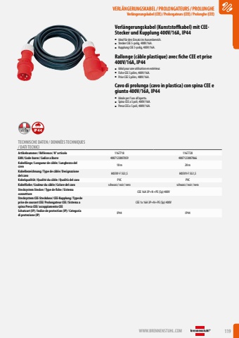 WWW.BRENNENSTUHL.COM 119VERL%u00c4NGERUNGSKABEL/PROLONGATEURS/PROLUNGHEVerl%u00e4ngerungskabel (CEE)/ Prolongateurs (CEE)/ Prolonghe (CEE)VERL%u00c4NGERUNGSKABEL/PROLONGATEURS/PROLUNGHEVerl%u00e4ngerungskabel (CEE)/ Prolongateurs (CEE)/ Prolonghe (CEE)Verl%u00e4ngerungskabel (Kunststoffkabel) mit CEEStecker und Kupplung 400V/16A, IP44%u25a0 Ideal f%u00fcr den Einsatz im Aussenbereich. %u25a0 Stecker CEE 5-polig, 400V/16A.%u25a0 Kupplung CEE 5-polig, 400V/16A.Rallonge (c%u00e2ble plastique) avec fiche CEE et prise 400V/16A, IP44%u25a0 Id%u00e9al pour une utilisation en ext%u00e9rieur.%u25a0 Fiche CEE 5 p%u00f4les, 400V/16A.%u25a0 Prise CEE 5 p%u00f4les, 400V/16A.Cavo di prolunga (cavo in plastica) con spina CEE e giunto 400V/16A, IP44%u25a0 Ideale per l%u2019uso all%u2019aperto.%u25a0 Spina CEE a 5 poli, 400V/16A.%u25a0 Presa CEE a 5 poli, 400V/16A.IP44TECHNISCHE DATEN / DONN%u00c9ES TECHNIQUES / DATI TECNICIArtikelnummer/ R%u00e9f%u00e9rence / N%u00b0 articolo 1167718 1167728EAN/ Code-barre / Codice a Barre 4007123007059 4007123007066Kabell%u00e4nge / Longueur de c%u00e2ble / Lunghezza del cavo10 m 20 mKabelbezeichnung / Type de c%u00e2ble / Designazione del cavo H05VV-F 5G1,5 H05VV-F 5G1,5Kabelqualit%u00e4t/ Qualit%u00e9 du c%u00e2ble / Qualit%u00e0 del cavo PVC PVCKabelfarbe / Couleur du c%u00e2ble / Colore del cavo schwarz/ noir/ nero schwarz/ noir/ neroStecksystem Stecker/ Type de fiche / Sistema connettore CEE 16A 3P+N+PE (5p) 400VStecksystem CEE-Steckdose/ CEE-Kupplung / Type de prise de courant CEE/ Prolongateur CEE/ Sistema a spina Presa CEE/ accoppiamento CEECEE 1x 16A 3P+N+PE (5p) 400VSchutzart (IP)/ Indice de protection (IP)/ Categoria di protezione (IP) IP44 IP44