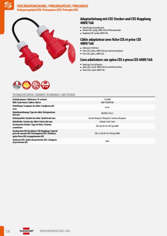 126 WWW.BRENNENSTUHL.COMVERL%u00c4NGERUNGSKABEL/PROLONGATEURS/PROLUNGHEVerl%u00e4ngerungskabel (CEE)/ Prolongateurs (CEE)/ Prolonghe (CEE)VERL%u00c4NGERUNGSKABEL/PROLONGATEURS/PROLUNGHEVerl%u00e4ngerungskabel (CEE)/ Prolongateurs (CEE)/ Prolonghe (CEE)Adapterleitung mit CEE-Stecker und CEE-Kupplung 400V/16A%u25a0 Ideal f%u00fcr den Aussenbereich.%u25a0 Stecker CEE 5-polig, 400V/16A mit Phasenwender.%u25a0 Kupplung CEE 5-polig, 400V/16A.C%u00e2ble adaptateur avec fiche CEE et prise CEE 400V/16A%u25a0 Id%u00e9al pour l%u2019ext%u00e9rieur.%u25a0 Fiche CEE 5 p%u00f4les, 400V/16A avec inverseur de phase.%u25a0 Prise CEE 5 p%u00f4les, 400V/16A.Cavo adattatore con spina CEE e presa CEE 400V/16A%u25a0 Ideale per l%u2019uso all%u2019aperto.%u25a0 Spina CEE a 5 poli, 400V/16A con invertitore di fase.%u25a0 Presa CEE a 5 poli, 400V/16A.ROBUSTSPECIALIP44TECHNISCHE DATEN / DONN%u00c9ES TECHNIQUES / DATI TECNICIArtikelnummer/ R%u00e9f%u00e9rence / N%u00b0 articolo 1132990EAN/ Code-barre / Codice a Barre 4007123099788Kabell%u00e4nge / Longueur de c%u00e2ble / Lunghezza del cavo0.4 mKabelbezeichnung / Type de c%u00e2ble / Designazione del cavo H07RN-F 5G1,5Kabelqualit%u00e4t/ Qualit%u00e9 du c%u00e2ble / Qualit%u00e0 del cavo Gummi-Neopren / N%u00e9opr%u00e8ne/ Gomma-NeopreneKabelfarbe / Couleur du c%u00e2ble / Colore del cavo schwarz/ noir/ neroStecksystem Stecker/ Type de fiche / Sistema connettore CEE 16A 3P+N+PE (5p) 400VStecksystem CEE-Steckdose/ CEE-Kupplung / Type de prise de courant CEE/ Prolongateur CEE/ Sistema a spina Presa CEE/ accoppiamento CEECEE 1x 16A 3P+N+PE (5p) 400VSchutzart (IP)/ Indice de protection (IP)/ Categoria di protezione (IP) IP44