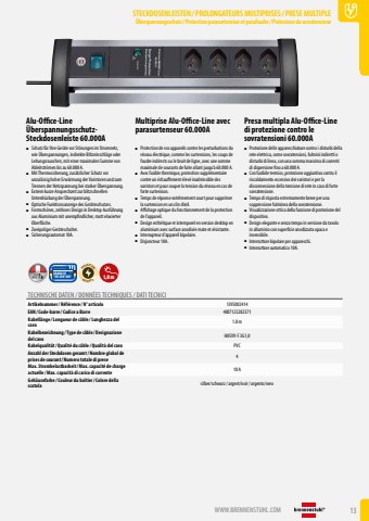 WWW.BRENNENSTUHL.COM 13STECKDOSENLEISTEN /PROLONGATEURS MULTIPRISES/PRESE MULTIPLE%u00dcberspannungsschutz/ Protection parasurtension et parafoudre/ Protezione da sovratensioneSTECKDOSENLEISTEN /PROLONGATEURS MULTIPRISES/PRESE MULTIPLE%u00dcberspannungsschutz/ Protection parasurtension et parafoudre/ Protezione da sovratensioneAlu-Office-Line %u00dcberspannungsschutzSteckdosenleiste 60.000AMultiprise Alu-Office-Line avec parasurtenseur 60.000APresa multipla Alu-Office-Line di protezione contro le sovratensioni 60.000A %u25a0 Schutz f%u00fcr Ihre Ger%u00e4te vor St%u00f6rungen im Stromnetz, wie %u00dcberspannungen, indirekte Blitzeinschl%u00e4ge oder Leitungsrauschen, mit einer maximalen Summe von Ableitstr%u00f6men bis zu 60.000 A.%u25a0 Mit Thermosicherung, zus%u00e4tzlicher Schutz vor unzul%u00e4ssig hoher Erw%u00e4rmung der Varistoren und zum Trennen der Netzspannung bei starker %u00dcberspannung.%u25a0 Extrem kurze Ansprechzeit zur blitzschnellen Unterdr%u00fcckung der %u00dcberspannung.%u25a0 Optische Funktionsanzeige des Ger%u00e4teschutzes.%u25a0 Formsch%u00f6nes, zeitloses Design in Desktop Ausf%u00fchrung aus Aluminium mit unempfindlicher, matt eloxierter Oberfl%u00e4che.%u25a0 Zweipoliger Ger%u00e4teschalter.%u25a0 Sicherungsautomat 10A.%u25a0 Protection de vos appareils contre les perturbations du r%u00e9seau %u00e9lectrique, comme les surtensions, les coups de foudre indirects ou le bruit de ligne, avec une somme maximale de courants de fuite allant jusqu%u2019%u00e0 60.000 A.%u25a0 Avec fusible thermique, protection suppl%u00e9mentaire contre un %u00e9chauffement %u00e9lev%u00e9 inadmissible des varistors et pour couper la tension du r%u00e9seau en cas de forte surtension.%u25a0 Temps de r%u00e9ponse extr%u00eamement court pour supprimer la surtension en un clin d%u2019%u0153il.%u25a0 Affichage optique du fonctionnement de la protection de l%u2019appareil.%u25a0 Design esth%u00e9tique et intemporel en version desktop en aluminium avec surface anodis%u00e9e mate et r%u00e9sistante.%u25a0 Interrupteur d%u2019appareil bipolaire.%u25a0 Disjoncteur 10A.%u25a0 Protezione delle apparecchiature contro i disturbi della rete elettrica, come sovratensioni, fulmini indiretti o disturbi di linea, con una somma massima di correnti di dispersione fino a 60.000 A.%u25a0 Con fusibile termico, protezione aggiuntiva contro il riscaldamento eccessivo dei varistori e per la disconnessione della tensione di rete in caso di forte sovratensione.%u25a0 Tempo di risposta estremamente breve per una soppressione fulminea della sovratensione.%u25a0 Visualizzazione ottica della funzione di protezione del dispositivo.%u25a0 Design elegante e senza tempo in versione da tavolo in alluminio con superficie anodizzata opaca e insensibile.%u25a0 Interruttore bipolare per apparecchi.%u25a0 Interruttore automatico 10A.60.000 APROTECTION 1,8mTECHNISCHE DATEN / DONN%u00c9ES TECHNIQUES / DATI TECNICIArtikelnummer/ R%u00e9f%u00e9rence / N%u00b0 articolo 1395002414EAN/ Code-barre / Codice a Barre 4007123282371Kabell%u00e4nge / Longueur de c%u00e2ble / Lunghezza del cavo1.8 mKabelbezeichnung / Type de c%u00e2ble / Designazione del cavo H05VV-F 3G1,0Kabelqualit%u00e4t/ Qualit%u00e9 du c%u00e2ble / Qualit%u00e0 del cavo PVCAnzahl der Steckdosen gesamt/ Nombre global de prises de courant/ Numero totale di prese 4Max. Strombelastbarkeit/ Max. capacit%u00e9 de charge actuelle / Max. capacit%u00e0 di carico di corrente 10 AGeh%u00e4usefarbe / Couleur du bo%u00eetier/ Colore della scatola silber/schwarz/ argent/noir/ argento/nero