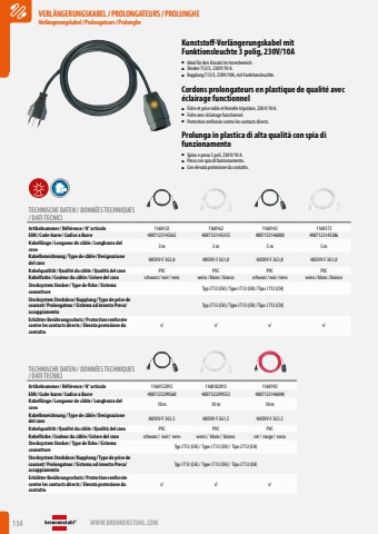 134 WWW.BRENNENSTUHL.COMVERL%u00c4NGERUNGSKABEL/PROLONGATEURS/PROLUNGHEVerl%u00e4ngerungskabel/ Prolongateurs/ ProlungheVERL%u00c4NGERUNGSKABEL/PROLONGATEURS/PROLUNGHEVerl%u00e4ngerungskabel/ Prolongateurs/ ProlungheKunststoff-Verl%u00e4ngerungskabel mit Funktionsleuchte 3 polig, 230V/10A%u25a0 Ideal f%u00fcr den Einsatz im Innenbereich.%u25a0 Stecker T12/3, 230 V/10 A.%u25a0 Kupplung T13/3, 230V/10A, mit Funktionsleuchte.Cordons prolongateurs en plastique de qualit%u00e9 avec %u00e9clairage functionnel%u25a0 Fiche et prise m%u00e2le et femelle tripolaire, 230 V/10 A.%u25a0 Fiche avec %u00e9clairage functionnel.%u25a0 Protection renforc%u00e9e contre les contacts directs.Prolunga in plastica di alta qualit%u00e0 con spia di funzionamento%u25a0 Spina e presa 3 poli, 230 V/10 A.%u25a0 Presa con spia di funzionamento.%u25a0 Con elevata protezione da contatto.CONTROLTECHNISCHE DATEN / DONN%u00c9ES TECHNIQUES / DATI TECNICIArtikelnummer/ R%u00e9f%u00e9rence / N%u00b0 articolo 1160132 1160162 1160142 1160172EAN/ Code-barre / Codice a Barre 4007123145362 4007123145355 4007123146000 4007123145386Kabell%u00e4nge / Longueur de c%u00e2ble / Lunghezza del cavo3 m 3 m 5 m 5 mKabelbezeichnung / Type de c%u00e2ble / Designazione del cavo H05VV-F 3G1,0 H05VV-F 3G1,0 H05VV-F 3G1,0 H05VV-F 3G1,0Kabelqualit%u00e4t/ Qualit%u00e9 du c%u00e2ble / Qualit%u00e0 del cavo PVC PVC PVC PVCKabelfarbe / Couleur du c%u00e2ble / Colore del cavo schwarz/ noir/ nero weiss/ blanc/ bianco schwarz/ noir/ nero weiss/ blanc/ biancoStecksystem Stecker/ Type de fiche / Sistema connettore Typ J T12 (CH)/ Type J T12 (CH)/ Tipo J T12 (CH)Stecksystem Steckdose/ Kupplung / Type de prise de courant/ Prolongateur/ Sistema ad innesto Presa/ accoppiamentoTyp J T13 (CH)/ Type J T13 (CH)/ Tipo J T13 (CH)Erh%u00f6hter Ber%u00fchrungsschutz/ Protection renforc%u00e9e contre les contacts directs/ Elevata protezione da contatto%uf001 %uf001 %uf001 %uf001TECHNISCHE DATEN / DONN%u00c9ES TECHNIQUES / DATI TECNICIArtikelnummer/ R%u00e9f%u00e9rence / N%u00b0 articolo 1160152015 1160182015 1160192EAN/ Code-barre / Codice a Barre 4007123299560 4007123299553 4007123146048Kabell%u00e4nge / Longueur de c%u00e2ble / Lunghezza del cavo10 m 10 m 10 mKabelbezeichnung / Type de c%u00e2ble / Designazione del cavo H05VV-F 3G1,5 H05VV-F 3G1,5 H05VV-F 3G1,5Kabelqualit%u00e4t/ Qualit%u00e9 du c%u00e2ble / Qualit%u00e0 del cavo PVC PVC PVCKabelfarbe / Couleur du c%u00e2ble / Colore del cavo schwarz/ noir/ nero weiss/ blanc/ bianco rot/ rouge/ rossoStecksystem Stecker/ Type de fiche / Sistema connettore Typ J T12 (CH)/ Type J T12 (CH)/ Tipo J T12 (CH)Stecksystem Steckdose/ Kupplung / Type de prise de courant/ Prolongateur/ Sistema ad innesto Presa/ accoppiamentoTyp J T13 (CH)/ Type J T13 (CH)/ Tipo J T13 (CH)Erh%u00f6hter Ber%u00fchrungsschutz/ Protection renforc%u00e9e contre les contacts directs/ Elevata protezione da contatto%uf001 %uf001 %uf001