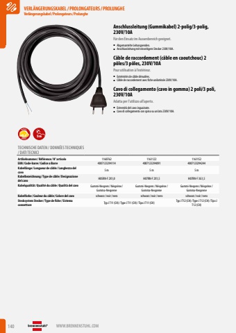140 WWW.BRENNENSTUHL.COMVERL%u00c4NGERUNGSKABEL/PROLONGATEURS/PROLUNGHEVerl%u00e4ngerungskabel/ Prolongateurs/ ProlungheVERL%u00c4NGERUNGSKABEL/PROLONGATEURS/PROLUNGHEVerl%u00e4ngerungskabel/ Prolongateurs/ ProlungheAnschlussleitung (Gummikabel) 2-polig/3-polig, 230V/10AF%u00fcr den Einsatz im Aussenbereich geeignet.%u25a0 Abgemantelte Leitungsenden.%u25a0 Anschlussleitung mit einseitigem Stecker 230V/10A.C%u00e2ble de raccordement (c%u00e2ble en caoutchouc) 2 p%u00f4les/3 p%u00f4les, 230V/10APour utilisation %u00e0 l%u2019ext%u00e9rieur.%u25a0 Extr%u00e9mit%u00e9s de c%u00e2ble d%u00e9nud%u00e9es.%u25a0 C%u00e2ble de raccordement avec fiche unilat%u00e9rale 230V/10A.Cavo di collegamento (cavo in gomma) 2 poli/3 poli, 230V/10AAdatta per l%u2019utilizzo all%u2019aperto.%u25a0 Estremit%u00e0 del cavo inguainate.%u25a0 Cavo di collegamento con spina su un lato 230V/10A.ROBUSTSPECIAL 5mTECHNISCHE DATEN / DONN%u00c9ES TECHNIQUES / DATI TECNICIArtikelnummer/ R%u00e9f%u00e9rence / N%u00b0 articolo 1160762 1161122 1161152EAN/ Code-barre / Codice a Barre 4007123294114 4007123294091 4007123294244Kabell%u00e4nge / Longueur de c%u00e2ble / Lunghezza del cavo5 m 5 m 5 mKabelbezeichnung / Type de c%u00e2ble / Designazione del cavo H05RN-F 2X1,0 H07RN-F 2X1,5 H07RN-F 3G1,5Kabelqualit%u00e4t/ Qualit%u00e9 du c%u00e2ble / Qualit%u00e0 del cavo Gummi-Neopren / N%u00e9opr%u00e8ne/ Gomma-NeopreneGummi-Neopren / N%u00e9opr%u00e8ne/ Gomma-NeopreneGummi-Neopren / N%u00e9opr%u00e8ne/ Gomma-NeopreneKabelfarbe / Couleur du c%u00e2ble / Colore del cavo schwarz/ noir/ nero schwarz/ noir/ nero schwarz/ noir/ neroStecksystem Stecker/ Type de fiche / Sistema connettore Typ J T11 (CH)/ Type J T11 (CH)/ Tipo J T11 (CH) Typ J T12 (CH)/ Type J T12 (CH)/ Tipo J T12 (CH)