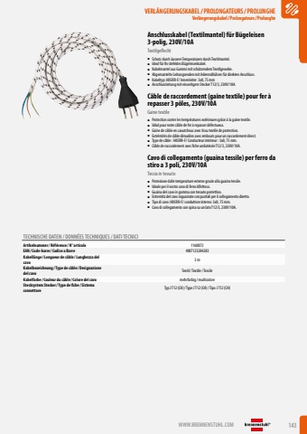 WWW.BRENNENSTUHL.COM 143VERL%u00c4NGERUNGSKABEL/PROLONGATEURS/PROLUNGHEVerl%u00e4ngerungskabel/ Prolongateurs/ ProlungheVERL%u00c4NGERUNGSKABEL/PROLONGATEURS/PROLUNGHEVerl%u00e4ngerungskabel/ Prolongateurs/ ProlungheAnschlusskabel (Textilmantel) f%u00fcr B%u00fcgeleisen 3-polig, 230V/10ATextilgeflecht%u25a0 Schutz durch %u00e4ussere Temperaturen durch Textilmantel. %u25a0 Ideal f%u00fcr Ihr defektes B%u00fcgeleisenkabel. %u25a0 Kabelmantel aus Gummi mit sch%u00fctzendem Textilgewebe.%u25a0 Abgemantelte Leitungsenden mit Aderendh%u00fclsen f%u00fcr direkten Anschluss.%u25a0 Kabeltyp: H05RR-F/ Innenleiter: 3x0, 75 mm%u25a0 Anschlussleitung mit einseitigem Stecker T12/3, 230V/10A.C%u00e2ble de raccordement (gaine textile) pour fer %u00e0 repasser 3 p%u00f4les, 230V/10AGaine textile%u25a0 Protection contre les temp%u00e9ratures ext%u00e9rieures gr%u00e2ce %u00e0 la gaine textile.%u25a0 Id%u00e9al pour votre c%u00e2ble de fer %u00e0 repasser d%u00e9fectueux.%u25a0 Gaine de c%u00e2ble en caoutchouc avec tissu textile de protection.%u25a0 Extr%u00e9mit%u00e9s de c%u00e2ble d%u00e9nud%u00e9es avec embouts pour un raccordement direct.%u25a0 Type de c%u00e2ble%u00a0: H05RR-F/ Conducteur int%u00e9rieur%u00a0: 3x0, 75 mm.%u25a0 C%u00e2ble de raccordement avec fiche unilat%u00e9rale T12/3, 230V/10A.Cavo di collegamento (guaina tessile) per ferro da stiro a 3 poli, 230V/10ATeccia in tessuto%u25a0 Protezione dalle temperature esterne grazie alla guaina tessile.%u25a0 Ideale per il vostro cavo di ferro difettoso.%u25a0 Guaina del cavo in gomma con tessuto protettivo.%u25a0 Estremit%u00e0 del cavo inguainate con puntali per il collegamento diretto.%u25a0 Tipo di cavo: H05RR-F/ conduttore interno: 3x0, 75 mm.%u25a0 Cavo di collegamento con spina su un lato T12/3, 230V/10A.TECHNISCHE DATEN / DONN%u00c9ES TECHNIQUES / DATI TECNICIArtikelnummer/ R%u00e9f%u00e9rence / N%u00b0 articolo 1160872EAN/ Code-barre / Codice a Barre 4007123284283Kabell%u00e4nge / Longueur de c%u00e2ble / Lunghezza del cavo3 mKabelbezeichnung / Type de c%u00e2ble / Designazione del cavoTextil/Textile/TessileKabelfarbe / Couleur du c%u00e2ble / Colore del cavo mehrfarbig/ multicoloreStecksystem Stecker/ Type de fiche / Sistema connettore Typ J T12 (CH)/ Type J T12 (CH)/ Tipo J T12 (CH)