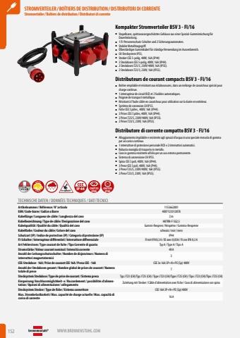152 WWW.BRENNENSTUHL.COMSTROMVERTEILER / BO%u00ceTIERS DE DISTRIBUTION / DISTRIBUTORI DI CORRENTEStromverteiler/ Bo%u00eetiers de distribution / Distributori di correnteSTROMVERTEILER / BO%u00ceTIERS DE DISTRIBUTION / DISTRIBUTORI DI CORRENTEStromverteiler/ Bo%u00eetiers de distribution / Distributori di correnteKompakter Stromverteiler BSV 3 - FI/16%u25a0 Stapelbares, spritzwassergesch%u00fctztes Geh%u00e4use aus einer Spezial-Gummimischung f%u00fcr Dauerbelastung.%u25a0 1 FI-Personenschutz-Schalter und 2 Sicherungsautomaten.%u25a0 Stabiler Metalltragegriff.%u25a0 %u00d6lbest%u00e4ndiges Gummikabel f%u00fcr st%u00e4ndige Verwendung im Aussenbereich.%u25a0 CH Stecksystem IP55, %u25a0 Stecker CEE 5-polig, 400V, 16A (IP44)%u25a0 3 Steckdosen CEE 5-polig, 400V, 16A (IP44).%u25a0 2 Steckdosen T25/5, 230V/400V, 16A (IP55).%u25a0 2 Steckdosen T23/3, 230V, 16A (IP55).Distributeurs de courant compacts BSV 3 - FI/16%u25a0 Bo%u00eetier empilable et r%u00e9sistant aux %u00e9claboussures, dans un m%u00e9lange de caoutchouc sp%u00e9cial pour charge continue.%u25a0 1 interrupteur de circuit RCD et 2 fusibles automatiques.%u25a0 Poign%u00e9e de transport m%u00e9tallique.%u25a0 R%u00e9sistant %u00e0 l%u2018huile c%u00e2ble en caoutchouc pour utilisation sur la dur%u00e9e en ext%u00e9rieur.%u25a0 Syst%u00e8me de connexion CH IP55.%u25a0 Fiche CEE 5 p%u00f4les , 400V, 16A (IP44).%u25a0 3 Prises CEE 5 p%u00f4les, 400V, 16A (IP44).%u25a0 2 Prises T25/5, 230V/400V, 16A (IP55).%u25a0 2 Prises T23/3, 230V, 16A (IP55).Distributore di corrente compatto BSV 3 - FI/16%u25a0 Alloggiamento impilabile e resistente agli spruzzi d%u2019acqua in una speciale mescola di gomma per un carico continuo.%u25a0 1 interruttore di protezione personale RCD e 2 interruttori automatici.%u25a0 Robusta maniglia di trasporto in metallo.%u25a0 Cavo in gomma resistente all%u2019olio per un uso esterno permanente.%u25a0 Sistema di connessione CH IP55.%u25a0 Spina CEE 5 poli, 400V, 16A (IP44).%u25a0 3 Prese CEE 5 poli, 400V, 16A (P44).%u25a0 2 Prese T25/5, 230V/400V, 16A (IP55).%u25a0 2 Prese T23/3, 230V, 16A (IP55).ROBUSTSPECIALFI-SAFETY IP44CEECH/T23IP55CH/T25IP55TECHNISCHE DATEN / DONN%u00c9ES TECHNIQUES / DATI TECNICIArtikelnummer/ R%u00e9f%u00e9rence / N%u00b0 articolo 1153662801EAN/ Code-barre / Codice a Barre 4007123312078Kabell%u00e4nge / Longueur de c%u00e2ble / Lunghezza del cavo 2 mKabelbezeichnung / Type de c%u00e2ble / Designazione del cavo H07RN-F 5G2,5Kabelqualit%u00e4t/ Qualit%u00e9 du c%u00e2ble / Qualit%u00e0 del cavo Gummi-Neopren / N%u00e9opr%u00e8ne/ Gomma-NeopreneKabelfarbe / Couleur du c%u00e2ble / Colore del cavo schwarz/ noir/ neroSchutzart (IP)/ Indice de protection (IP)/ Categoria di protezione (IP) IP44FI-Schalter/ Interrupteur diff%u00e9rentiel/ Interruttore differenziale FI mit IFN 0,3 A / ID avec 0,03A / FI con IFN 0,3 AArt Fehlerstrom/ Type courant de fuite / Tipo Corrente di guasto Typ A / Type A / Tipo AStromst%u00e4rke / Valeur courant nominal/ Intensit%u00e0 corrente 40 AAnzahl der Leitungsschutzschalter/ Nombre de disjoncteurs/ Numero di interruttori magnetotermici 3CEE-Steckdose - 16A / Prise de courant CEE 16A / Presa CEE - 16A CEE 3x 16A 3P+N+PE (5p) 400VAnzahl der Steckdosen gesamt/ Nombre global de prises de courant/ Numero totale di prese 7Stecksystem Steckdose / Type de prise de courant/ Sistema presa Typ J T23 (CH)/Typ J T25 (CH)/ Type J T23 (CH)/Type J T25 (CH)/ Tipo J T23 (CH)/Tipo J T25 (CH)Einspeisung/ Anschlussm%u00f6glichkeit- e / Raccordement / possibilit%u00e9s d%u2019alimentation / Opzioni di alimentazione/ collegamento Zuleitung mit Stecker/ C%u00e2ble d%u2019alimentation avec fiche/ Cavo di alimentazione con spinaStecksystem Stecker/ Type de fiche / Sistema connettore CEE 16A 3P+N+PE (5p) 400VMax. Strombelastbarkeit/ Max. capacit%u00e9 de charge actuelle / Max. capacit%u00e0 di carico di corrente 16 A
