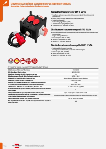 154 WWW.BRENNENSTUHL.COMSTROMVERTEILER / BO%u00ceTIERS DE DISTRIBUTION / DISTRIBUTORI DI CORRENTEStromverteiler/ Bo%u00eetiers de distribution / Distributori di correnteSTROMVERTEILER / BO%u00ceTIERS DE DISTRIBUTION / DISTRIBUTORI DI CORRENTEStromverteiler/ Bo%u00eetiers de distribution / Distributori di correnteKompakter Stromverteiler BSV 3 -LS/16%u25a0 Stapelbares, spritzwassergesch%u00fctztes Geh%u00e4use aus einer Spezial-Gummimischung f%u00fcr Dauerbelastung.%u25a0 %u00c4usserst robust, schlagfest, alterungs- und witterungsbest%u00e4ndig%u25a0 Stabiler Metalltragegriff.%u25a0 Stecker CEE 5-polig, 400V, 16A (IP44)%u25a0 3 Steckdosen CEE 5-polig, 400V, 16A (IP44).%u25a0 2 Steckdosen T25/5, 230V/400V, 16A (IP55).Distributeur de courant compact BSV 3 -LS/16%u25a0 Bo%u00eetier empilable et r%u00e9sistant aux %u00e9claboussures, dans un m%u00e9lange de caoutchouc sp%u00e9cial pour charge continue.%u25a0 Poign%u00e9e de transport m%u00e9tallique.%u25a0 Fiche CEE 5 p%u00f4les , 400V, 16A (IP44).%u25a0 3 Prises CEE 5 p%u00f4les, 400V, 16A (IP44).%u25a0 2 Prises T25/5, 230V/400V, 16A (IP55).Distributore di corrente compatto BSV 3 -LS/16%u25a0 Stabile maniglia di trasporto in metallo.%u25a0 Cavo in gomma resistente all%u2019olio per un ulilizzo costante all%u2019aperto.%u25a0 Spina CEE 5 poli, 400V, 16A (IP44).%u25a0 3 Prese CEE 5 poli, 400V, 16A (P44).%u25a0 2 Prese T25/5, 230V/400V, 16A (IP55).ROBUSTSPECIALIP44CEECH/T25IP55TECHNISCHE DATEN / DONN%u00c9ES TECHNIQUES / DATI TECNICIArtikelnummer/ R%u00e9f%u00e9rence / N%u00b0 articolo 1153402800EAN/ Code-barre / Codice a Barre 4007123311651Kabell%u00e4nge / Longueur de c%u00e2ble / Lunghezza del cavo 1 mKabelbezeichnung / Type de c%u00e2ble / Designazione del cavo H07RN-F 5G2,5Kabelqualit%u00e4t/ Qualit%u00e9 du c%u00e2ble / Qualit%u00e0 del cavo Gummi-Neopren / N%u00e9opr%u00e8ne/ Gomma-NeopreneKabelfarbe / Couleur du c%u00e2ble / Colore del cavo schwarz/ noir/ neroSchutzart (IP)/ Indice de protection (IP)/ Categoria di protezione (IP) IP44FI-Schalter/ Interrupteur diff%u00e9rentiel/ Interruttore differenziale Ohne/ Sans/ SenzaCEE-Steckdose - 16A / Prise de courant CEE 16A / Presa CEE - 16A CEE 3x 16A 3P+N+PE (5p) 400VAnzahl der Steckdosen gesamt/ Nombre global de prises de courant/ Numero totale di prese 5Stecksystem Steckdose / Type de prise de courant/ Sistema presa Typ J T25 (CH)/ Type J T25 (CH)/ Tipo J T25 (CH)Einspeisung/ Anschlussm%u00f6glichkeit- e / Raccordement / possibilit%u00e9s d%u2019alimentation / Opzioni di alimentazione/ collegamento Zuleitung mit Stecker/ C%u00e2ble d%u2019alimentation avec fiche/ Cavo di alimentazione con spinaStecksystem Stecker/ Type de fiche / Sistema connettore CEE 16A 3P+N+PE (5p) 400VMax. Strombelastbarkeit/ Max. capacit%u00e9 de charge actuelle / Max. capacit%u00e0 di carico di corrente 16 A