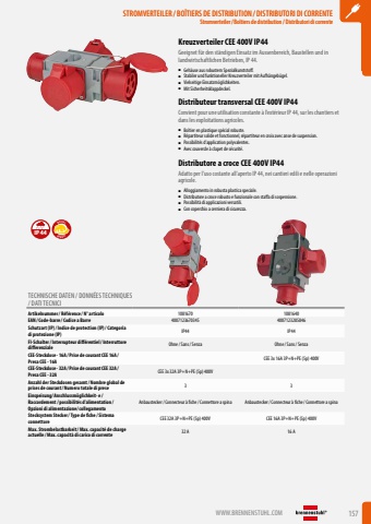 WWW.BRENNENSTUHL.COM 157STROMVERTEILER / BO%u00ceTIERS DE DISTRIBUTION / DISTRIBUTORI DI CORRENTEStromverteiler/ Bo%u00eetiers de distribution / Distributori di correnteSTROMVERTEILER / BO%u00ceTIERS DE DISTRIBUTION / DISTRIBUTORI DI CORRENTEStromverteiler/ Bo%u00eetiers de distribution / Distributori di correnteKreuzverteiler CEE 400V IP44Geeignet f%u00fcr den st%u00e4ndigen Einsatz im Aussenbereich, Baustellen und in landwirtschaftlichen Betrieben, IP 44.%u25a0 Geh%u00e4use aus robustem Spezialkunststoff.%u25a0 Stabiler und funktioneller Kreuzverteiler mit Aufh%u00e4ngeb%u00fcgel.%u25a0 Vielseitige Einsatzm%u00f6glichkeiten.%u25a0 Mit Sicherheitsklappdeckel.Distributeur transversal CEE 400V IP44Convient pour une utilisation constante %u00e0 l%u2019ext%u00e9rieur IP 44, sur les chantiers et dans les exploitations agricoles.%u25a0 Bo%u00eetier en plastique sp%u00e9cial robuste.%u25a0 R%u00e9partiteur solide et fonctionnel, r%u00e9partiteur en croix avec anse de suspension.%u25a0 Possibilit%u00e9s d%u2019application polyvalentes.%u25a0 Avec couvercle %u00e0 clapet de s%u00e9curit%u00e9.Distributore a croce CEE 400V IP44Adatto per l%u2019uso costante all%u2019aperto IP 44, nei cantieri edili e nelle operazioni agricole.%u25a0 Alloggiamento in robusta plastica speciale.%u25a0 Distributore a croce robusto e funzionale con staffa di sospensione.%u25a0 Possibilit%u00e0 di applicazioni versatili.%u25a0 Con coperchio a cerniera di sicurezza.IP44 ROBUSTSPECIALTECHNISCHE DATEN / DONN%u00c9ES TECHNIQUES / DATI TECNICIArtikelnummer/ R%u00e9f%u00e9rence / N%u00b0 articolo 1081670 1081640EAN/ Code-barre / Codice a Barre 4007123670345 4007123285846Schutzart (IP)/ Indice de protection (IP)/ Categoria di protezione (IP) IP44 IP44FI-Schalter/ Interrupteur diff%u00e9rentiel/ Interruttore differenziale Ohne/ Sans/ Senza Ohne/ Sans/ SenzaCEE-Steckdose - 16A / Prise de courant CEE 16A / Presa CEE - 16A CEE 3x 16A 3P+N+PE (5p) 400VCEE-Steckdose - 32A / Prise de courant CEE 32A / Presa CEE - 32A CEE 3x 32A 3P+N+PE (5p) 400VAnzahl der Steckdosen gesamt/ Nombre global de prises de courant/ Numero totale di prese 3 3Einspeisung/ Anschlussm%u00f6glichkeit- e / Raccordement / possibilit%u00e9s d%u2019alimentation / Opzioni di alimentazione/ collegamentoAnbaustecker/ Connecteur %u00e0 fiche/ Connettore a spina Anbaustecker/ Connecteur %u00e0 fiche/ Connettore a spinaStecksystem Stecker/ Type de fiche / Sistema connettore CEE 32A 3P+N+PE (5p) 400V CEE 16A 3P+N+PE (5p) 400VMax. Strombelastbarkeit/ Max. capacit%u00e9 de charge actuelle / Max. capacit%u00e0 di carico di corrente 32 A 16 A