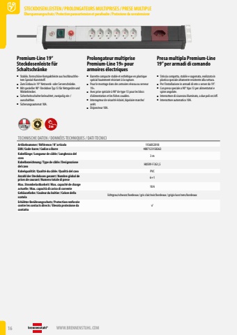 16 WWW.BRENNENSTUHL.COMSTECKDOSENLEISTEN /PROLONGATEURS MULTIPRISES/PRESE MULTIPLE%u00dcberspannungsschutz/ Protection parasurtension et parafoudre/ Protezione da sovratensioneSTECKDOSENLEISTEN /PROLONGATEURS MULTIPRISES/PRESE MULTIPLE%u00dcberspannungsschutz/ Protection parasurtension et parafoudre/ Protezione da sovratensionePremium-Line 19%u201c Steckdosenleiste f%u00fcr Schaltschr%u00e4nkeProlongateur multiprise Premium-Line 19%u00bb pour armoires %u00e9lectriquesPresa multipla Premium-Line 19%u201d per armadi di comando%u25a0 Stabile, formsch%u00f6ne Kompaktleiste aus hochbruchfestem Spezial-Kunststoff.%u25a0 Zum Einbau in 19%u201c Netzwerk- oder Serverschr%u00e4nke.%u25a0 Mit spezieller 90%u00b0-Steckdose Typ 13 f%u00fcr Netzger%u00e4te und Winkelstecker.%u25a0 Sicherheitsschalter beleuchtet, zweipolig ein-/ausschaltbar.%u25a0 Sicherungsautomat 10A.%u25a0 Barrette compacte stable et esth%u00e9tique en plastique sp%u00e9cial hautement r%u00e9sistant %u00e0 la rupture.%u25a0 Pour le montage dans des armoires r%u00e9seau ou serveur 19%u00bb.%u25a0 Avec prise sp%u00e9ciale %u00e0 90%u00b0 de type 13 pour les blocs d%u2019alimentation et les fiches coud%u00e9es.%u25a0 Interrupteur de s%u00e9curit%u00e9 %u00e9clair%u00e9, bipolaire marche/arr%u00eat.%u25a0 Disjoncteur 10A.%u25a0 Striscia compatta, stabile e sagomata, realizzata in plastica speciale altamente resistente alla rottura.%u25a0 Per l%u2019installazione in armadi di rete o server da 19%u201d.%u25a0 Con presa speciale a 90%u00b0 tipo 13 per alimentatori e spine angolate.%u25a0 Interruttore di sicurezza illuminato, a due poli on/off.%u25a0 Interruttore automatico 10A.60.000 APROTECTION 3mTECHNISCHE DATEN / DONN%u00c9ES TECHNIQUES / DATI TECNICIArtikelnummer/ R%u00e9f%u00e9rence / N%u00b0 articolo 1156052018EAN/ Code-barre / Codice a Barre 4007123158263Kabell%u00e4nge / Longueur de c%u00e2ble / Lunghezza del cavo3 mKabelbezeichnung / Type de c%u00e2ble / Designazione del cavo H05VV-F 3G1,5Kabelqualit%u00e4t/ Qualit%u00e9 du c%u00e2ble / Qualit%u00e0 del cavo PVCAnzahl der Steckdosen gesamt/ Nombre global de prises de courant/ Numero totale di prese 6+1Max. Strombelastbarkeit/ Max. capacit%u00e9 de charge actuelle / Max. capacit%u00e0 di carico di corrente 10 AGeh%u00e4usefarbe / Couleur du bo%u00eetier/ Colore della scatola lichtgrau/schwarz/bordeaux/ gris clair/noir/bordeaux/ grigio luce/nero/bordeauxErh%u00f6hter Ber%u00fchrungsschutz/ Protection renforc%u00e9e contre les contacts directs/ Elevata protezione da contatto%uf001