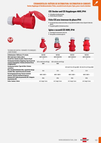 WWW.BRENNENSTUHL.COM 165STROMVERTEILER / BO%u00ceTIERS DE DISTRIBUTION / DISTRIBUTORI DI CORRENTEStecker, Kupplungen & Steckdoseneins%u00e4tze/ Fiches, raccords & inserts de prise/ Spine, prese e inserti a bicchiereSTROMVERTEILER / BO%u00ceTIERS DE DISTRIBUTION / DISTRIBUTORI DI CORRENTEStecker, Kupplungen & Steckdoseneins%u00e4tze/ Fiches, raccords & inserts de prise/ Spine, prese e inserti a bicchiereCEE-Stecker und CEE-Kupplungen 400V, IP44%u25a0 Schraublose Anschlusstechnik.%u25a0 Hochwertig und schlagfest.Fiche CEE avec inverseur de phase IP44%u25a0 En tournant deux contacts de la fiche, il est possible de modifier et donc d%u2019ajuster l%u2019ordre des phases.%u25a0 De grande qualit%u00e9 et r%u00e9sistant aux chocs.Spine e raccordi CEE 400V, IP44%u25a0 Tecnologia di connessione senza viti.%u25a0 Alta qualit%u00e0 e resistenza agli urti.IP44TECHNISCHE DATEN / DONN%u00c9ES TECHNIQUES / DATI TECNICIArtikelnummer/ R%u00e9f%u00e9rence / N%u00b0 articolo 1081040 1081060 1081030 1081050EAN/ Code-barre / Codice a Barre 4007123029174 4007123029198 4007123029167 4007123029181Anzahl Pole / Nombre de p%u00f4les/ Numero di poli 5 5 5 5Stecksystem Steckdose/ Kupplung / Type de prise de courant/ Prolongateur/ Sistema ad innesto Presa/ accoppiamentoCEE 1x 16A 3P+N+PE (5p) 400VCEE 1x 32A 3P+N+PE (5p) 400VStecksystem Stecker/ Type de fiche / Sistema connettore CEE 16A 3P+N+PE (5p) 400V CEE 32A 3P+N+PE (5p) 400VMax. Strombelastbarkeit/ Max. capacit%u00e9 de charge actuelle / Max. capacit%u00e0 di carico di corrente 16 A 32 A 16 A 32 ANenneingangsspannung / Tension nominale d%u2019entr%u00e9e / Tensione nominale di ingresso 400 V / 400 V~ 400 V / 400 V~ 400 V / 400 V~ 400 V / 400 V~Schutzart (IP)/ Indice de protection (IP)/ Categoria di protezione (IP) IP44 IP44 IP44 IP44Farbe / Couleur/ Colore rot/ rouge/ rosso rot/ rouge/ rosso rot/ rouge/ rosso rot/ rouge/ rosso