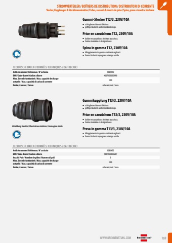 WWW.BRENNENSTUHL.COM 169STROMVERTEILER / BO%u00ceTIERS DE DISTRIBUTION / DISTRIBUTORI DI CORRENTEStecker, Kupplungen & Steckdoseneins%u00e4tze/ Fiches, raccords & inserts de prise/ Spine, prese e inserti a bicchiereSTROMVERTEILER / BO%u00ceTIERS DE DISTRIBUTION / DISTRIBUTORI DI CORRENTEStecker, Kupplungen & Steckdoseneins%u00e4tze/ Fiches, raccords & inserts de prise/ Spine, prese e inserti a bicchiereGummi-Stecker T12/3, 230V/10A%u25a0 schlagfestes Gummi Geh%u00e4use.%u25a0 griffige Bauform und schlankes Design.Prise en caoutchouc T12, 230V/10A%u25a0 bo%u00eetier en caoutchouc r%u00e9sistant aux chocs.%u25a0 Forme maniable et design %u00e9lanc%u00e9.Spina in gomma T12, 230V/10A%u25a0 Alloggiamento in gomma resistente agli urti.%u25a0 Forma facile da impugnare e design sottile.TECHNISCHE DATEN / DONN%u00c9ES TECHNIQUES / DATI TECNICIArtikelnummer/ R%u00e9f%u00e9rence / N%u00b0 articolo 1081442EAN/ Code-barre / Codice a Barre 4007123032990Max. Strombelastbarkeit/ Max. capacit%u00e9 de charge actuelle / Max. capacit%u00e0 di carico di corrente 10 AFarbe / Couleur/ Colore schwarz/ noir/ neroGummikupplung T13/3, 230V/10A%u25a0 schlagfestes Gummi Geh%u00e4use.%u25a0 griffige Bauform und schlankes Design.Prise en caoutchouc T13/3, 230V/10A%u25a0 bo%u00eetier en caoutchouc r%u00e9sistant aux chocs.%u25a0 Forme maniable et design %u00e9lanc%u00e9.Presa in gomma T13/3, 230V/10A%u25a0 Alloggiamento in gomma resistente agli urti.%u25a0 Forma facile da impugnare e design sottile.TECHNISCHE DATEN / DONN%u00c9ES TECHNIQUES / DATI TECNICIArtikelnummer/ R%u00e9f%u00e9rence / N%u00b0 articolo 1081452EAN/ Code-barre / Codice a Barre 4007123033607Anzahl Pole / Nombre de p%u00f4les/ Numero di poli 3Max. Strombelastbarkeit/ Max. capacit%u00e9 de charge actuelle / Max. capacit%u00e0 di carico di corrente 10 AFarbe / Couleur/ Colore schwarz/ noir/ neroAbbildung %u00e4hnlich / Illustration similaire / Immagine simile