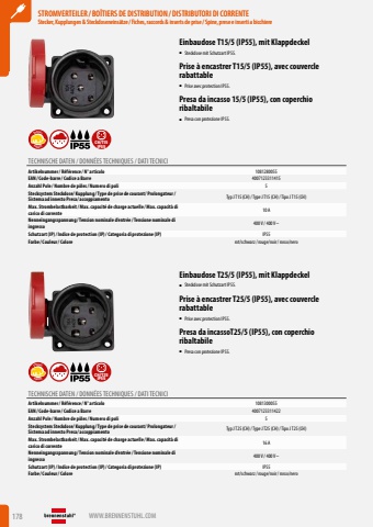 178 WWW.BRENNENSTUHL.COMSTROMVERTEILER / BO%u00ceTIERS DE DISTRIBUTION / DISTRIBUTORI DI CORRENTEStecker, Kupplungen & Steckdoseneins%u00e4tze/ Fiches, raccords & inserts de prise/ Spine, prese e inserti a bicchiereSTROMVERTEILER / BO%u00ceTIERS DE DISTRIBUTION / DISTRIBUTORI DI CORRENTEStecker, Kupplungen & Steckdoseneins%u00e4tze/ Fiches, raccords & inserts de prise/ Spine, prese e inserti a bicchiereEinbaudose T15/5 (IP55), mit Klappdeckel%u25a0 Steckdose mit Schutzart IP55.Prise %u00e0 encastrer T15/5 (IP55), avec couvercle rabattable%u25a0 Prise avec protection IP55.Presa da incasso 15/5 (IP55), con coperchio ribaltabile%u25a0 Presa con protezione IP55.ROBUSTSPECIALCH/T15IP55TECHNISCHE DATEN / DONN%u00c9ES TECHNIQUES / DATI TECNICIArtikelnummer/ R%u00e9f%u00e9rence / N%u00b0 articolo 1081280055EAN/ Code-barre / Codice a Barre 4007123311415Anzahl Pole / Nombre de p%u00f4les/ Numero di poli 5Stecksystem Steckdose/ Kupplung / Type de prise de courant/ Prolongateur/ Sistema ad innesto Presa/ accoppiamento Typ J T15 (CH)/ Type J T15 (CH)/ Tipo J T15 (CH)Max. Strombelastbarkeit/ Max. capacit%u00e9 de charge actuelle / Max. capacit%u00e0 di carico di corrente 10 ANenneingangsspannung / Tension nominale d%u2019entr%u00e9e / Tensione nominale di ingresso 400 V / 400 V~Schutzart (IP)/ Indice de protection (IP)/ Categoria di protezione (IP) IP55Farbe / Couleur/ Colore rot/schwarz/ rouge/noir/ rosso/neroEinbaudose T25/5 (IP55), mit Klappdeckel%u25a0 Steckdose mit Schutzart IP55.Prise %u00e0 encastrer T25/5 (IP55), avec couvercle rabattable%u25a0 Prise avec protection IP55.Presa da incassoT25/5 (IP55), con coperchio ribaltabile%u25a0 Presa con protezione IP55.ROBUSTSPECIALCH/T25IP55TECHNISCHE DATEN / DONN%u00c9ES TECHNIQUES / DATI TECNICIArtikelnummer/ R%u00e9f%u00e9rence / N%u00b0 articolo 1081300055EAN/ Code-barre / Codice a Barre 4007123311422Anzahl Pole / Nombre de p%u00f4les/ Numero di poli 5Stecksystem Steckdose/ Kupplung / Type de prise de courant/ Prolongateur/ Sistema ad innesto Presa/ accoppiamento Typ J T25 (CH)/ Type J T25 (CH)/ Tipo J T25 (CH)Max. Strombelastbarkeit/ Max. capacit%u00e9 de charge actuelle / Max. capacit%u00e0 di carico di corrente 16 ANenneingangsspannung / Tension nominale d%u2019entr%u00e9e / Tensione nominale di ingresso 400 V / 400 V~Schutzart (IP)/ Indice de protection (IP)/ Categoria di protezione (IP) IP55Farbe / Couleur/ Colore rot/schwarz/ rouge/noir/ rosso/nero
