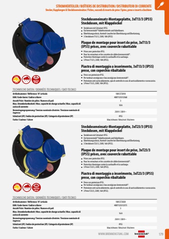 WWW.BRENNENSTUHL.COM 179STROMVERTEILER / BO%u00ceTIERS DE DISTRIBUTION / DISTRIBUTORI DI CORRENTEStecker, Kupplungen & Steckdoseneins%u00e4tze/ Fiches, raccords & inserts de prise/ Spine, prese e inserti a bicchiereSTROMVERTEILER / BO%u00ceTIERS DE DISTRIBUTION / DISTRIBUTORI DI CORRENTEStecker, Kupplungen & Steckdoseneins%u00e4tze/ Fiches, raccords & inserts de prise/ Spine, prese e inserti a bicchiereSteckdoseneinsatz-Montageplatte, 3xT13/3 (IP55) Steckdosen, mit Klappdeckel%u25a0 Steckdosen mit Schutzart IP55.%u25a0 F%u00fcr brennenstuhl%u00ae Kabeltrommeln und Kabelboxen.%u25a0 %u00dcberhitzungsschutz, Kontroll-Leuchte bei %u00dcberhitzung und %u00dcberlastung.%u25a0 3 Steckdosen T13/3, 230V, 10A (IP55)Plaque de montage pour insert de prise, 3xT13/3 (IP55) prises, avec couvercle rabattable%u25a0 Prises avec protection IP55.%u25a0 Pour les enrouleurs et les cassettes de c%u00e2bles brennenstuhl%u00ae.%u25a0 Protection thermique contre la surchauffe et la surcharge.%u25a0 3 Prises T13/3, 230V, 10A (IP55).Piastra di montaggio a inserimento, 3xT13/3 (IP55) prese, con coperchio ribaltabile%u25a0 Prese con protezione IP55.%u25a0 Per tamburi avvolgicavo e box avvolgicavo brennenstuhl%u00ae.%u25a0 Protezione anti surriscaldamento, spia di controllo in caso di surriscaldamento e sovraccarico.%u25a0 3 Prese T13/3, 230V, 10A (IP55). ROBUSTSPECIALCH/T13IP55ROBUSTSPECIALCH/T23IP55TECHNISCHE DATEN / DONN%u00c9ES TECHNIQUES / DATI TECNICIArtikelnummer/ R%u00e9f%u00e9rence / N%u00b0 articolo 1081272020EAN/ Code-barre / Codice a Barre 4007123312375Anzahl Pole / Nombre de p%u00f4les/ Numero di poli 3Max. Strombelastbarkeit/ Max. capacit%u00e9 de charge actuelle / Max. capacit%u00e0 di carico di corrente 16 ANenneingangsspannung / Tension nominale d%u2019entr%u00e9e / Tensione nominale di ingresso 250 V / 250 V~Schutzart (IP)/ Indice de protection (IP)/ Categoria di protezione (IP) IP55Farbe / Couleur/ Colore blau/schwarz/ bleu/noir/ blu/neroSteckdoseneinsatz-Montageplatte, 3xT23/3 (IP55) Steckdosen, mit Klappdeckel%u25a0 Steckdosen mit Schutzart IP55.%u25a0 F%u00fcr brennenstuhl%u00ae Kabeltrommeln und Kabelboxen.%u25a0 %u00dcberhitzungsschutz, Kontroll-Leuchte bei %u00dcberhitzung und %u00dcberlastung.%u25a0 3 Steckdosen T23/3, 230V, 16A (IP55).Plaque de montage pour insert de prise, 3xT23/3 (IP55) prises, avec couvercle rabattable%u25a0 Prises avec protection IP55.%u25a0 Pour les enrouleurs et les cassettes de c%u00e2bles brennenstuhl%u00ae.%u25a0 Protection thermique contre la surchauffe et la surcharge.%u25a0 3 Prises T23/3, 230V, 16A (IP55).Piastra di montaggio a inserimento, 3xT23/3 (IP55) prese, con coperchio ribaltabile%u25a0 Prese con protezione IP55.%u25a0 Per tamburi avvolgicavo e box avvolgicavo brennenstuhl%u00ae.%u25a0 Protezione anti surriscaldamento, spia di controllo in caso di surriscaldamento e sovraccarico.%u25a0 3 Prese T23/3, 230V, 16A (IP55).TECHNISCHE DATEN / DONN%u00c9ES TECHNIQUES / DATI TECNICIArtikelnummer/ R%u00e9f%u00e9rence / N%u00b0 articolo 1081272010EAN/ Code-barre / Codice a Barre 4007123312368Anzahl Pole / Nombre de p%u00f4les/ Numero di poli 3Max. Strombelastbarkeit/ Max. capacit%u00e9 de charge actuelle / Max. capacit%u00e0 di carico di corrente 10 ANenneingangsspannung / Tension nominale d%u2019entr%u00e9e / Tensione nominale di ingresso 250 V / 250 V~Schutzart (IP)/ Indice de protection (IP)/ Categoria di protezione (IP) IP55Farbe / Couleur/ Colore blau/schwarz/ bleu/noir/ blu/nero
