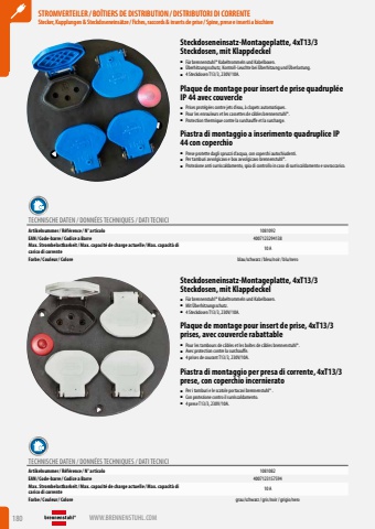 180 WWW.BRENNENSTUHL.COMSTROMVERTEILER / BO%u00ceTIERS DE DISTRIBUTION / DISTRIBUTORI DI CORRENTEStecker, Kupplungen & Steckdoseneins%u00e4tze/ Fiches, raccords & inserts de prise/ Spine, prese e inserti a bicchiereSTROMVERTEILER / BO%u00ceTIERS DE DISTRIBUTION / DISTRIBUTORI DI CORRENTEStecker, Kupplungen & Steckdoseneins%u00e4tze/ Fiches, raccords & inserts de prise/ Spine, prese e inserti a bicchiereSteckdoseneinsatz-Montageplatte, 4xT13/3 Steckdosen, mit Klappdeckel%u25a0 F%u00fcr brennenstuhl%u00ae Kabeltrommeln und Kabelboxen.%u25a0 %u00dcberhitzungsschutz, Kontroll-Leuchte bei %u00dcberhitzung und %u00dcberlastung.%u25a0 4 Steckdosen T13/3, 230V/10A.Plaque de montage pour insert de prise quadrupl%u00e9e IP 44 avec couvercle%u25a0 Prises prot%u00e9g%u00e9es contre jets d%u2019eau, %u00e0 clapets automatiques.%u25a0 Pour les enrouleurs et les cassettes de c%u00e2bles brennenstuhl%u00ae.%u25a0 Protection thermique contre la surchauffe et la surcharge.Piastra di montaggio a inserimento quadruplice IP 44 con coperchio%u25a0 Prese protette dagli spruzzi d%u2019acqua, con coperchi autochiudenti.%u25a0 Per tamburi avvolgicavo e box avvolgicavo brennenstuhl%u00ae.%u25a0 Protezione anti surriscaldamento, spia di controllo in caso di surriscaldamento e sovraccarico.TECHNISCHE DATEN / DONN%u00c9ES TECHNIQUES / DATI TECNICIArtikelnummer/ R%u00e9f%u00e9rence / N%u00b0 articolo 1081092EAN/ Code-barre / Codice a Barre 4007123294138Max. Strombelastbarkeit/ Max. capacit%u00e9 de charge actuelle / Max. capacit%u00e0 di carico di corrente 10 AFarbe / Couleur/ Colore blau/schwarz/ bleu/noir/ blu/neroTECHNISCHE DATEN / DONN%u00c9ES TECHNIQUES / DATI TECNICIArtikelnummer/ R%u00e9f%u00e9rence / N%u00b0 articolo 1081082EAN/ Code-barre / Codice a Barre 4007123157594Max. Strombelastbarkeit/ Max. capacit%u00e9 de charge actuelle / Max. capacit%u00e0 di carico di corrente 10 AFarbe / Couleur/ Colore grau/schwarz/gris/noir/grigio/neroSteckdoseneinsatz-Montageplatte, 4xT13/3 Steckdosen, mit Klappdeckel%u25a0 F%u00fcr brennenstuhl%u00ae Kabeltrommeln und Kabelboxen.%u25a0 Mit %u00dcberhitzungsschutz. %u25a0 4 Steckdosen T13/3, 230V/10A.Plaque de montage pour insert de prise, 4xT13/3 prises, avec couvercle rabattable%u25a0 Pour les tambours de c%u00e2bles et les bo%u00eetes de c%u00e2bles brennenstuhl%u00ae.%u25a0 Avec protection contre la surchauffe.%u25a0 4 prises de courant T13/3, 230V/10A.Piastra di montaggio per presa di corrente, 4xT13/3 prese, con coperchio incernierato%u25a0 Per i tamburi e le scatole portacavi brennenstuhl%u00ae .%u25a0 Con protezione contro il surriscaldamento.%u25a0 4 prese T13/3, 230V/10A.