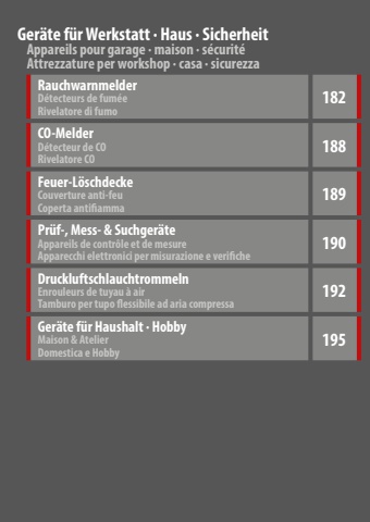 Appareils pour garage %u00b7 maison %u00b7 s%u00e9curit%u00e9Ger%u00e4te f%u00fcr Werkstatt %u00b7 Haus %u00b7 SicherheitAttrezzature per workshop %u00b7 casa %u00b7 sicurezzaRauchwarnmelderD%u00e9tecteurs de fum%u00e9e Rivelatore di fumo182CO-MelderD%u00e9tecteur de CO Rivelatore CO188Feuer-L%u00f6schdeckeCouverture anti-feu Coperta antifiamma189Pr%u00fcf-, Mess- & Suchger%u00e4teAppareils de contr%u00f4le et de mesure Apparecchi elettronici per misurazione e verifiche190DruckluftschlauchtrommelnEnrouleurs de tuyau %u00e0 air Tamburo per tupo flessibile ad aria compressa192Ger%u00e4te f%u00fcr Haushalt %u00b7 HobbyMaison & Atelier Domestica e Hobby195