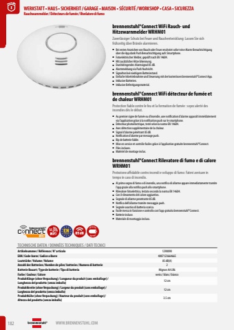 182 WWW.BRENNENSTUHL.COMWERKSTATT %u2022 HAUS %u2022 SICHERHEIT/ GARAGE %u2022 MAISON %u2022 S%u00c9CURIT%u00c9/WORKSHOP %u2022 CASA %u2022 SICUREZZARauchwarnmelder/ D%u00e9tecteurs de fum%u00e9e/ Rivelatore di fumoWERKSTATT %u2022 HAUS %u2022 SICHERHEIT/ GARAGE %u2022 MAISON %u2022 S%u00c9CURIT%u00c9/WORKSHOP %u2022 CASA %u2022 SICUREZZARauchwarnmelder/ D%u00e9tecteurs de fum%u00e9e/ Rivelatore di fumobrennenstuhl%u00aeConnect WiFi Rauch- und Hitzewarnmelder WRHM01Zuverl%u00e4ssiger Schutz bei Feuer und Rauchentwicklung: Lassen Sie sich fr%u00fchzeitig %u00fcber Br%u00e4nde alarmieren.%u25a0 Bei ersten Anzeichen von Rauch oder Feuer erscheint sofort eine Alarm-Benachrichtigung %u00fcber die App dank Push Benachrichtigung aufs Smartphone. %u25a0 Fotoelektrischer Melder, gepr%u00fcft nach EN 14604.%u25a0 Mit zus%u00e4tzlicher Hitze Erkennung.%u25a0 Durchdringendes Alarmsignal 85 dB.%u25a0 Alarmmeldung via Push Nachricht.%u25a0 Signalton bei niedrigem Batteriestand.%u25a0 Einfache Inbetriebnahme und Steuerung mit der kostenlosen brennenstuhl%u00aeConnect App.%u25a0 Inklusive Batterien.%u25a0 Inklusive Befestigungsmaterial.brennenstuhl%u00aeConnect WiFi d%u00e9tecteur de fum%u00e9e et de chaleur WRHM01Protection fiable contre le feu et la formation de fum%u00e9e : soyez alert%u00e9 des incendies d%u00e8s le d%u00e9but.%u25a0 Au premier signe de fum%u00e9e ou d%u2019incendie, une notification d%u2019alarme appara%u00eet imm%u00e9diatement via l%u2019application gr%u00e2ce %u00e0 la notification push sur le smartphone. %u25a0 D%u00e9tecteur photo%u00e9lectrique, test%u00e9 selon la norme EN 14604.%u25a0 Avec d%u00e9tection suppl%u00e9mentaire de la chaleur.%u25a0 Signal d%u2019alarme p%u00e9n%u00e9trant 85 dB.%u25a0 Notification d%u2019alarme par message push.%u25a0 Bip de batterie faible.%u25a0 Mise en service et contr%u00f4le faciles gr%u00e2ce %u00e0 l%u2019application gratuite brennenstuhl%u00aeConnect.%u25a0 Piles incluses.%u25a0 Mat%u00e9riel de montage inclus.brennenstuhl%u00aeConnect Rilevatore di fumo e di calore WRHM01Protezione affidabile contro incendi e sviluppo di fumo: Fatevi avvisare in tempo in caso di incendio.%u25a0 Al primo segno di fumo o di incendio, una notifica di allarme appare immediatamente tramite l%u2019app grazie alla notifica push allo smartphone. %u25a0 Rilevatore fotoelettrico, testato secondo la norma EN 14604.%u25a0 Con il rilevamento del calore aggiuntivo.%u25a0 Segnale di allarme penetrante 85 dB.%u25a0 Notifica dell%u2019allarme tramite messaggio push.%u25a0 Segnale acustico di batteria scarica.%u25a0 Facile messa in funzione e controllo con l%u2019app gratuita brennenstuhl%u00aeConnect.%u25a0 Batterie incluse.%u25a0 Materiale di montaggio incluso.2,4GHz EN14604 85dB BATTERYINCLUSIVETECHNISCHE DATEN / DONN%u00c9ES TECHNIQUES / DATI TECNICIArtikelnummer/ R%u00e9f%u00e9rence / N%u00b0 articolo 1290090EAN/ Code-barre / Codice a Barre 4007123664665Lautst%u00e4rke / Volume / Volume 85 dB(A)Anzahl der Batterien / Nombre de piles/ batteries/ Numero di batterie 2Batterie Bauart/ Type de batterie / Tipo di batteria Mignon AA LR6Farbe / Couleur/ Colore weiss/ blanc/ biancoProduktl%u00e4nge (ohne Verpackung)/ Longueur du produit (sans emballage)/ Lunghezza del prodotto (senza imballo) 12 cmProduktbreite (ohne Verpackung)/ Largeur du produit (sans emballage)/ Larghezza del prodotto (senza imballo) 12 cmProdukth%u00f6he (ohne Verpackung)/ Hauteur du produit (sans emballage)/ Altezza del prodotto (senza imballo) 3.5 cm