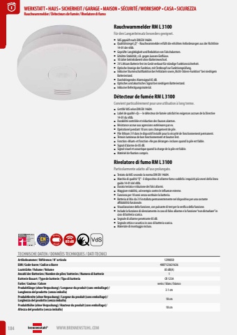 184 WWW.BRENNENSTUHL.COMWERKSTATT %u2022 HAUS %u2022 SICHERHEIT/ GARAGE %u2022 MAISON %u2022 S%u00c9CURIT%u00c9/WORKSHOP %u2022 CASA %u2022 SICUREZZARauchwarnmelder/ D%u00e9tecteurs de fum%u00e9e/ Rivelatore di fumoWERKSTATT %u2022 HAUS %u2022 SICHERHEIT/ GARAGE %u2022 MAISON %u2022 S%u00c9CURIT%u00c9/WORKSHOP %u2022 CASA %u2022 SICUREZZARauchwarnmelder/ D%u00e9tecteurs de fum%u00e9e/ Rivelatore di fumoRauchwarnmelder RM L 3100F%u00fcr den Langzeiteinsatz besonders geeignet.%u25a0 VdS gepr%u00fcft nach DIN EN 14604.%u25a0 Qualit%u00e4tssiegel %u201eQ%u201c - Rauchwarnmelder erf%u00fcllt die erh%u00f6hten Anforderungen aus der Richtlinie 14-01 der vfdb.%u25a0 Gepr%u00fcfte Langlebigkeit und Reduktion von Falschalarmen.%u25a0 Erh%u00f6hte Stabilit%u00e4t, z.B. gegen %u00e4ussere Einfl%u00fcsse.%u25a0 10 Jahre betriebsbereit ohne Batteriewechsel.%u25a0 3 V Lithium Batterie fest im Ger%u00e4t verbaut f%u00fcr st%u00e4ndige Funktionssicherheit.%u25a0 Optische Anzeige der Funktion, mit Testknopf zur Funktionspr%u00fcfung.%u25a0 Inklusive Stummschaltfunktion bei Fehlalarm sowie %u201eNicht-St%u00f6ren-Funktion%u201c bei niedrigem Batteriestand.%u25a0 Durchdringendes Alarmsignal 85 dB.%u25a0 Optisches und akustisches Signal bei niedrigem Batteriestand.%u25a0 Inklusive Befestigungsmaterial.D%u00e9tecteur de fum%u00e9e RM L 3100Convient particuli%u00e8rement pour une utilisation %u00e0 long terme.%u25a0 Certifi%u00e9 VdS selon DIN EN 14604.%u25a0 Label de qualit%u00e9 %u00abQ%u00bb %u2013 le d%u00e9tecteur de fum%u00e9e satisfait les exigences accrues de la Directive 14-01 du vfdb.%u25a0 Durabilit%u00e9 contr%u00f4l%u00e9e et r%u00e9duction des fausses alarmes.%u25a0 R%u00e9sistance accrue aux agressions ext%u00e9rieures par ex.%u25a0 Op%u00e9rationel pendant 10 ans sans changement de pile.%u25a0 Pile lithium 3 V dans le dispositif install%u00e9 pour la s%u00e9curit%u00e9 de fonctionnement permanent.%u25a0 T%u00e9moin lumineux de bon fonctionnement et bouton Test.%u25a0 Fonction %u00abMuet%u00bb et fonction %u00abNe pas d%u00e9ranger%u00bb incluses quand la pile est faible.%u25a0 Signal d%u2019alarme de 85 dB.%u25a0 Signal visuel et acoustique quand la charge de la pile est faible.%u25a0 Mat%u00e9riel de fixation compris.Rivelatore di fumo RM L 3100Particolarmente adatto all%u2019uso prolungato.%u25a0 Testato da VdS secondo la norma DIN EN 14604.%u25a0 Marchio di qualit%u00e0 %u201cQ%u201d - il dispositivo di allarme fumo soddisfa i requisiti pi%u00f9 severi della linea guida 14-01 del vfdb.%u25a0 Durata testata e riduzione dei falsi allarmi.%u25a0 Maggiore stabilit%u00e0, ad esempio contro le influenze esterne.%u25a0 Funziona per 10 anni senza sostituire la batteria.%u25a0 Batteria al litio da 3 V installata permanentemente nel dispositivo per una costante affidabilit%u00e0 funzionale.%u25a0 Visualizzazione della funzione, con pulsante di test per la verifica della funzione.%u25a0 Include la funzione di silenziamento in caso di falso allarme e la funzione %u201cnon disturbare%u201d in caso di batteria scarica.%u25a0 Segnale di allarme penetrante 85 dB.%u25a0 Segnale ottico e acustico in caso di batteria scarica.%u25a0 Materiale di montaggio incluso.GUT (2,1)Im Test:17 RauchmelderAusgabe01/202120GP33EN14604 BATTERYINCLUSIVE 85dBTECHNISCHE DATEN / DONN%u00c9ES TECHNIQUES / DATI TECNICIArtikelnummer/ R%u00e9f%u00e9rence / N%u00b0 articolo 1290050EAN/ Code-barre / Codice a Barre 4007123631636Lautst%u00e4rke / Volume / Volume 85 dB(A)Anzahl der Batterien / Nombre de piles/ batteries/ Numero di batterie 1Batterie Bauart/ Type de batterie / Tipo di batteria CR 123AFarbe / Couleur/ Colore weiss/ blanc/ biancoProduktl%u00e4nge (ohne Verpackung)/ Longueur du produit (sans emballage)/ Lunghezza del prodotto (senza imballo) 3.1 cmProduktbreite (ohne Verpackung)/ Largeur du produit (sans emballage)/ Larghezza del prodotto (senza imballo) 10 cmProdukth%u00f6he (ohne Verpackung)/ Hauteur du produit (sans emballage)/ Altezza del prodotto (senza imballo) 10 cm