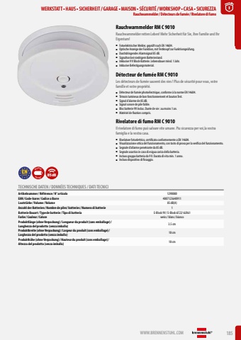 WWW.BRENNENSTUHL.COM 185WERKSTATT %u2022 HAUS %u2022 SICHERHEIT/ GARAGE %u2022 MAISON %u2022 S%u00c9CURIT%u00c9/WORKSHOP %u2022 CASA %u2022 SICUREZZARauchwarnmelder/ D%u00e9tecteurs de fum%u00e9e/ Rivelatore di fumoWERKSTATT %u2022 HAUS %u2022 SICHERHEIT/ GARAGE %u2022 MAISON %u2022 S%u00c9CURIT%u00c9/WORKSHOP %u2022 CASA %u2022 SICUREZZARauchwarnmelder/ D%u00e9tecteurs de fum%u00e9e/ Rivelatore di fumoRauchwarnmelder RM C 9010Rauchwarnmelder retten Leben! Mehr Sicherheit f%u00fcr Sie, Ihre Familie und Ihr Eigentum!%u25a0 Fotoelektrischer Melder, gepr%u00fcft nach EN 14604.%u25a0 Optische Anzeige der Funktion, mit Testknopf zur Funktionspr%u00fcfung.%u25a0 Durchdringendes Alarmsignal 85 dB.%u25a0 Signalton bei niedrigem Batteriestand.%u25a0 Inklusive 9 V Block-Batterie. Lebensdauer mind. 1 Jahr.%u25a0 Inklusive Befestigungsmaterial.D%u00e9tecteur de fum%u00e9e RM C 9010Les d%u00e9tecteurs de fum%u00e9e sauvent des vies ! Plus de s%u00e9curit%u00e9 pour vous, votre famille et votre propri%u00e9t%u00e9.%u25a0 D%u00e9tecteur de fum%u00e9e photo%u00e9lectrique, conforme %u00e0 la norme EN 14604.%u25a0 T%u00e9moin lumineux de bon fonctionnement et bouton Test.%u25a0 Signal d%u2019alarme de 85 dB.%u25a0 Signal sonore de pile faible.%u25a0 Bloc batterie 9V inclus. Dur%u00e9e de vie%u00a0: au moins 1 an.%u25a0 Mat%u00e9riel de fixation compris.Rivelatore di fumo RM C 9010Il rivelatore di fumo pu%u00f2 salvare vite umane. Piu sicurezza per voi,la vostra famiglia e la vostra casa.%u25a0 Rivelatore fotoelettrico, certificato conformemente a EN 14604.%u25a0 Visualizzazione ottica del funzionamento, con tasto di prova per la verifica del funzionamento.%u25a0 Segnale d%u2019allarme penetrante da 85 dB.%u25a0 Segnale acustico in caso di esigua carica della batteria.%u25a0 Incluso gruppo batteria da 9 V. Durata di vita min. 1 anno.%u25a0 Incluso dispositivo di fissaggio.EN14604 BATTERYINCLUSIVE 85dBTECHNISCHE DATEN / DONN%u00c9ES TECHNIQUES / DATI TECNICIArtikelnummer/ R%u00e9f%u00e9rence / N%u00b0 articolo 1290080EAN/ Code-barre / Codice a Barre 4007123640911Lautst%u00e4rke / Volume / Volume 85 dB(A)Anzahl der Batterien / Nombre de piles/ batteries/ Numero di batterie 1Batterie Bauart/ Type de batterie / Tipo di batteria E-Block 9V / E-Block 6F22/ 6LR61Farbe / Couleur/ Colore weiss/ blanc/ biancoProduktl%u00e4nge (ohne Verpackung)/ Longueur du produit (sans emballage)/ Lunghezza del prodotto (senza imballo) 3.5 cmProduktbreite (ohne Verpackung)/ Largeur du produit (sans emballage)/ Larghezza del prodotto (senza imballo) 10 cmProdukth%u00f6he (ohne Verpackung)/ Hauteur du produit (sans emballage)/ Altezza del prodotto (senza imballo) 10 cm