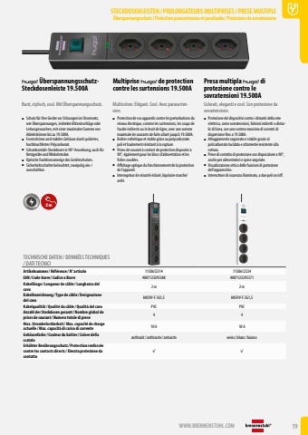 WWW.BRENNENSTUHL.COM 19STECKDOSENLEISTEN /PROLONGATEURS MULTIPRISES/PRESE MULTIPLE%u00dcberspannungsschutz/ Protection parasurtension et parafoudre/ Protezione da sovratensioneSTECKDOSENLEISTEN /PROLONGATEURS MULTIPRISES/PRESE MULTIPLE%u00dcberspannungsschutz/ Protection parasurtension et parafoudre/ Protezione da sovratensione%uf003 %u00dcberspannungsschutzSteckdosenleiste 19.500AMultiprise %uf003 de protection contre les surtensions 19.500APresa multipla %uf003 di protezione contro le sovratensioni 19.500ABunt, stylisch, cool. Mit %u00dcberspannungsschutz. Multicolore. El%u00e9gant. Cool. Avec parasurtension.Colorati, eleganti e cool. Con protezione da sovratensione.%u25a0 Schutz f%u00fcr Ihre Ger%u00e4te vor St%u00f6rungen im Stromnetz, wie %u00dcberspannungen, indirekte Blitzeinschl%u00e4ge oder Leitungsrauschen, mit einer maximalen Summe von Ableitstr%u00f6men bis zu 19.500A.%u25a0 Formsch%u00f6nes und stabiles Geh%u00e4use durch poliertes, hochbruchfestes Polycarbonat.%u25a0 Schutzkontakt-Steckdosen in 90%u00b0-Anordnung, auch f%u00fcr Netzger%u00e4te und Winkelstecker.%u25a0 Optische Funktionsanzeige des Ger%u00e4teschutzes.%u25a0 Sicherheitsschalter beleuchtet, zweipolig ein-/ausschaltbar.%u25a0 Protection de vos appareils contre les perturbations du r%u00e9seau %u00e9lectrique, comme les surtensions, les coups de foudre indirects ou le bruit de ligne, avec une somme maximale de courants de fuite allant jusqu%u2019%u00e0 19.500A.%u25a0 Bo%u00eetier esth%u00e9tique et stable gr%u00e2ce au polycarbonate poli et hautement r%u00e9sistant %u00e0 la rupture.%u25a0 Prises de courant %u00e0 contact de protection dispos%u00e9es %u00e0 90%u00b0, %u00e9galement pour les blocs d%u2019alimentation et les fiches coud%u00e9es.%u25a0 Affichage optique du fonctionnement de la protection de l%u2019appareil.%u25a0 Interrupteur de s%u00e9curit%u00e9 %u00e9clair%u00e9, bipolaire marche/arr%u00eat.%u25a0 Protezione dei dispositivi contro i disturbi della rete elettrica, come sovratensioni, fulmini indiretti o disturbi di linea, con una somma massima di correnti di dispersione fino a 19.500A.%u25a0 Alloggiamento sagomato e stabile grazie al policarbonato lucidato e altamente resistente alla rottura.%u25a0 Prese di contatto di protezione con disposizione a 90%u00b0, anche per alimentatori e spine angolate.%u25a0 Visualizzazione ottica delle funzioni di protezione dell%u2019apparecchio.%u25a0 Interruttore di sicurezza illuminato, a due poli on/off.19.500 APROTECTION 2mTECHNISCHE DATEN / DONN%u00c9ES TECHNIQUES / DATI TECNICIArtikelnummer/ R%u00e9f%u00e9rence / N%u00b0 articolo 1150612314 1150612324EAN/ Code-barre / Codice a Barre 4007123295388 4007123295371Kabell%u00e4nge / Longueur de c%u00e2ble / Lunghezza del cavo2 m 2 mKabelbezeichnung / Type de c%u00e2ble / Designazione del cavo H05VV-F 3G1,5 H05VV-F 3G1,5Kabelqualit%u00e4t/ Qualit%u00e9 du c%u00e2ble / Qualit%u00e0 del cavo PVC PVCAnzahl der Steckdosen gesamt/ Nombre global de prises de courant/ Numero totale di prese 4 4Max. Strombelastbarkeit/ Max. capacit%u00e9 de charge actuelle / Max. capacit%u00e0 di carico di corrente 10 A 10 AGeh%u00e4usefarbe / Couleur du bo%u00eetier/ Colore della scatola anthrazit/ anthracite/ antracite weiss/ blanc/ biancoErh%u00f6hter Ber%u00fchrungsschutz/ Protection renforc%u00e9e contre les contacts directs/ Elevata protezione da contatto%uf001 %uf001