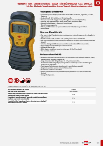 WWW.BRENNENSTUHL.COM 191WERKSTATT %u2022 HAUS %u2022 SICHERHEIT/ GARAGE %u2022 MAISON %u2022 S%u00c9CURIT%u00c9/WORKSHOP %u2022 CASA %u2022 SICUREZZAPr%u00fcf-, Mess- & Suchger%u00e4te/ Appareils de contr%u00f4le et de mesure/ Apparecchi elettronici per misurazione e verificheWERKSTATT %u2022 HAUS %u2022 SICHERHEIT/ GARAGE %u2022 MAISON %u2022 S%u00c9CURIT%u00c9/WORKSHOP %u2022 CASA %u2022 SICUREZZAPr%u00fcf-, Mess- & Suchger%u00e4te/ Appareils de contr%u00f4le et de mesure/ Apparecchi elettronici per misurazione e verificheFeuchtigkeits-Detector MD%u25a0 Zur Bestimmung des Feuchtigkeitsgehalts von Holz oder Baustoffen wie z.B. Beton, Ziegel, Estrich, Gipskarton, Tapeten, etc.%u25a0 Messbereich von 5 - 50 % f%u00fcr Holz bzw. 1,5 - 33 % bei Baustoffen.%u25a0 Anzeige %u00fcber grosses LCD-Display (in Prozent, Aufl%u00f6sung 0,1 %) sowie akustisch (abschaltbar).%u25a0 Praktische %u201eHold%u201c-Funktion erm%u00f6glicht Messen auch an schlecht zug%u00e4nglichen Stellen.%u25a0 Automatische Abschaltung ca. 3 Minuten nach letztem Gebrauch.%u25a0 Batterie-Unterspannungsanzeige.%u25a0 Robustes, handliches Geh%u00e4use mit separatem Batteriefach f%u00fcr 9 V Block (Lieferung ohne Batterie).%u25a0 Mit Schutzkappe.D%u00e9tecteur d%u2019humidit%u00e9 MD%u25a0 Pour mesurer le degr%u00e9 d%u2019humidit%u00e9 du bois ou de mat%u00e9riaux comme le b%u00e9ton, les briques, les sols, le placopl%u00e2tre, les papiers peints, etc.%u25a0 Plage de mesure de 5 %u00e0 50% pour le bois ou de 1,5 %u00e0 33% pour les mat%u00e9riaux de construction.%u25a0 Indication sur un large %u00e9cran LCD (en pourcentage, r%u00e9solution 0,1%) ainsi que par signal acoustique (pouvant %u00eatre d%u00e9sactiv%u00e9).%u25a0 La fonction %u00abHold%u00bb permet d%u2019effectuer une mesure m%u00eame dans des endroits difficilement accessibles.%u25a0 Arr%u00eat automatique environ 3 minutes apr%u00e8s la derni%u00e8re utilisation.%u25a0 Affichage de l%u2019usure des piles.%u25a0 Bo%u00eetier robuste et maniable avec compartiment s%u00e9par%u00e9 pour pile bloc 9V (non fournie).%u25a0 Avec couvercle de protection.Rivelatore di umidit%u00e0 MD%u25a0 Per determinare il contenuto di umidit%u00e0 nel legno o nel materiale edilizio come ad esempio calcestruzzo, mattoni, pavimenti continui, cartongesso, tappezzeria, ecc.%u25a0 Campo di misurazione di 5 - 50 % per il legno e 15 - 33 % per il materiale edilizio.%u25a0 Visualizzazione tramite un ampio display LCD (in percentuale, risoluzione 0,1 %) e anche mediante segnale acustico (che pu%u00f2 essere spento).%u25a0 Pratica funzione %u201chold%u201d che consente misurazioni anche in punti difficilmente accessibili.%u25a0 Spegnimento automatico dopo circa 3 minuti dall%u2019ultimo utilizzo.%u25a0 Visualizzazione sottotensione della batteria.%u25a0 Involucro pratico e robusto con vano portabatteria separato per batteria da 9 V (batteria non inclusa nella fornitura).%u25a0 Con coperchio di protezione.TECHNISCHE DATEN / DONN%u00c9ES TECHNIQUES / DATI TECNICIArtikelnummer/ R%u00e9f%u00e9rence / N%u00b0 articolo 1298680EAN/ Code-barre / Codice a Barre 4007123249893Produktl%u00e4nge (ohne Verpackung)/ Longueur du produit (sans emballage)/ Lunghezza del prodotto (senza imballo) 15 cmProduktbreite (ohne Verpackung)/ Largeur du produit (sans emballage)/ Larghezza del prodotto (senza imballo) 6.5 cmProdukth%u00f6he (ohne Verpackung)/ Hauteur du produit (sans emballage)/ Altezza del prodotto (senza imballo) 2.5 cm