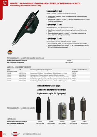 196 WWW.BRENNENSTUHL.COMWERKSTATT %u2022 HAUS %u2022 SICHERHEIT/ GARAGE %u2022 MAISON %u2022 S%u00c9CURIT%u00c9/WORKSHOP %u2022 CASA %u2022 SICUREZZAHaushalt & Hobby/ Maison & Atelier/ Domestica e HobbyWERKSTATT %u2022 HAUS %u2022 SICHERHEIT/ GARAGE %u2022 MAISON %u2022 S%u00c9CURIT%u00c9/WORKSHOP %u2022 CASA %u2022 SICUREZZAHaushalt & Hobby/ Maison & Atelier/ Domestica e HobbyErsatzstichel f%u00fcr SignographAccessoires pour graveur %u00e9lectriqueReplacement stylus for SignographTECHNISCHE DATEN / DONN%u00c9ES TECHNIQUES / DATI TECNICIArtikelnummer/ R%u00e9f%u00e9rence / N%u00b0 articolo 1500530 1500540 1508130 1508240 1508250EAN/ Code-barre / Codice a Barre 4007123011964 4007123020492 4007123020485 4007123020508 4007123020515Signograph 25 SetElektro-Gravierer - Gravieren so einfach wie schreiben.%u25a0 Leistungsstarkes Gravierger%u00e4t, 25 Watt, mit geh%u00e4rtetem Stichel, sowie austauschbarem Hartmetall-Stichel.%u25a0 Vibrationsst%u00e4rke: a (peak)~= 74,02 m/s%u00b2 = 7,545 g (max. Scheitelwert) a (rms)~= 52,34 m/s%u00b2 = 5,336 g (max. Effektivwert).Signograph 25 SetGraveur %u00e9lectrique - pour graver comme on %u00e9crit.%u25a0 Appareil %u00e0 graver puissant, 25 watts, avec burin tremp%u00e9 et burin en m%u00e9tal dur interchangeables.%u25a0 Intensit%u00e9 des vibrations%u00a0: a (peak)~= 74,02m/s%u00b2 = 7,545g (valeur maximale usine) a (rms)~= 52,34m/s%u00b2 = 5,336g (valeur nominale).Signograph 25 SetIncisori elettrici - Incidere diventa facile come scrivere.%u25a0 Un incisore efficiente, 25 Watt, con bulino temprato e bulino in metallo duro sostituibile.%u25a0 Grandezza di vibrazione: a (peak)~= 74,02m/s%u00b2 = 7,545 g (valore vertice max.) a (rms)~= 52,34 m/s%u00b2 = 5,336 g (valore effettivo max.).TECHNISCHE DATEN / DONN%u00c9ES TECHNIQUES / DATI TECNICIArtikelnummer/ R%u00e9f%u00e9rence / N%u00b0 articolo 1500742EAN/ Code-barre / Codice a Barre 4007123014682ZUBEH%u00d6R / ACCESSOIRES/ ACCESSORIArt.Nr./R%u00e9f%u00e9rence / Art.no.EAN Bezeichnung / Description / Designazione zu Art.Nr./ Pour les r%u00e9f%u00e9rences/per Art. no.1500530 4007123011964 Diamantstichel 2,5 x 18mm/ Pointe au diamant/ Bulino in diamante 2,5 x 18mm 15007421500540 4007123020492 Hartmetallstichel/ Pointe au carbure de tungst%u00e8ne/ Bulino in metallo duro 15007421508130 4007123020485 Adapter f%u00fcr Ersatzstichel/ Adaptateur porte-pointes/ Adattore per bulino di ricambio 15007421508240 4007123020508 Modellierstift, kugelf%u00f6rmig/ Pointe profil%u00e9e forme sph%u00e9rique/ Matita modellante, rotonda 15007421508250 4007123020515 Modellierstift, spitz/ Pointe profil%u00e9e forme conique/ Matita modellante, a punta 1500742