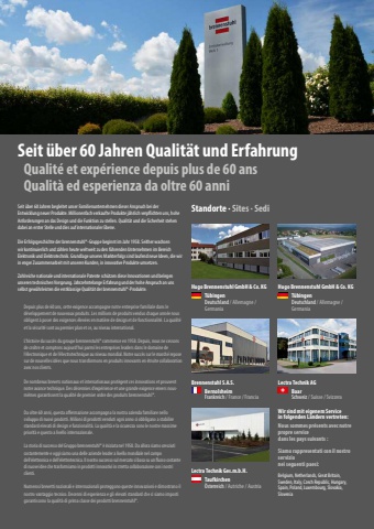 Seit %u00fcber 60 Jahren begleitet unser Familienunternehmen dieser Anspruch bei der Entwicklung neuer Produkte. Millionenfach verkaufte Produkte j%u00e4hrlich verpflichten uns, hohe Anforderungen an das Design und die Funktion zu stellen. Qualit%u00e4t und die Sicherheit stehen dabei an erster Stelle und dies auf internationaler Ebene.Die Erfolgsgeschichte der brennenstuhl%u00ae-Gruppe beginnt im Jahr 1958. Seither wachsen wir kontinuierlich und z%u00e4hlen heute weltweit zu den f%u00fchrenden Unternehmen im Bereich Elektronik und Elektrotechnik. Grundlage unseres Markterfolgs sind laufend neue Ideen, die wir in enger Zusammenarbeit mit unseren Kunden, in innovative Produkte umsetzen.Zahlreiche nationale und internationale Patente sch%u00fctzen diese Innovationen und belegen unseren technischen Vorsprung. Jahrzehntelange Erfahrung und der hohe Anspruch an uns selbst gew%u00e4hrleisten die erstklassige Qualit%u00e4t der brennenstuhl%u00ae-Produkte.Depuis plus de 60 ans, cette exigence accompagne notre entreprise familiale dans le d%u00e9veloppement de nouveaux produits. Les millions de produits vendus chaque ann%u00e9e nous obligent %u00e0 poser des exigences %u00e9lev%u00e9es en mati%u00e8re de design et de fonctionnalit%u00e9. La qualit%u00e9 et la s%u00e9curit%u00e9 sont au premier plan et ce, au niveau international.L%u2018histoire du succ%u00e8s du groupe brennenstuhl%u00ae commence en 1958. Depuis, nous ne cessons de cro%u00eetre et comptons aujourd%u2018hui parmi les entreprises leaders dans le domaine de l%u2018%u00e9lectronique et de l%u2018%u00e9lectrotechnique au niveau mondial. Notre succ%u00e8s sur le march%u00e9 repose sur de nouvelles id%u00e9es que nous transformons en produits innovants en %u00e9troite collaboration avec nos clients.De nombreux brevets nationaux et internationaux prot%u00e8gent ces innovations et prouvent notre avance technique. Des d%u00e9cennies d%u2018exp%u00e9rience et une grande exigence envers nousm%u00eames garantissent la qualit%u00e9 de premier ordre des produits brennenstuhl%u00ae.Hugo Brennenstuhl GmbH & Co. KGT%u00fcbingen Deutschland / Allemagne / GermaniaHugo Brennenstuhl GmbH & Co. KGT%u00fcbingen Deutschland / Allemagne / GermaniaBrennenstuhl S.A.S.Bernolsheim Frankreich / France / FranciaLectra Technik AGBaar Schweiz / Suisse / SvizzeraLectra Technik Ges.m.b.H.Taufkirchen %u00d6sterreich / Autriche / AustriaWir sind mit eigenem Service in folgenden L%u00e4ndern vertreten:Nous sommes pr%u00e9sents avec notre propre service dans les pays suivants : Siamo rappresentati con il nostro servizio nei seguenti paesi:Belgium, Netherlands, Great Britain, Sweden, Italy, Czech Republic, Hungary, Spain, Poland, Luxembourg, Slovakia, SloveniaDa oltre 60 anni, questa affermazione accompagna la nostra azienda familiare nello sviluppo di nuovi prodotti. Milioni di prodotti venduti ogni anno ci obbligano a stabilire standard elevati di design e funzionalit%u00e0. La qualit%u00e0 e la sicurezza sono le nostre massime priorit%u00e0 e questo a livello internazionale.La storia di successo del Gruppo brennenstuhl%u00ae %u00e8 iniziata nel 1958. Da allora siamo cresciuti costantemente e oggi siamo una delle aziende leader a livello mondiale nel campo dell%u2018elettronica e dell%u2018elettrotecnica. Il nostro successo sul mercato si basa su un flusso costante di nuove idee che trasformiamo in prodotti innovativi in stretta collaborazione con i nostri clienti.Numerosi brevetti nazionali e internazionali proteggono queste innovazioni e dimostrano il nostro vantaggio tecnico. Decenni di esperienza e gli elevati standard che ci siamo imposti garantiscono la qualit%u00e0 di prima classe dei prodotti brennenstuhl%u00ae.Standorte %u00b7 Sites %u00b7 SediQualit%u00e9 et exp%u00e9rience depuis plus de 60 ansSeit %u00fcber 60 Jahren Qualit%u00e4t und ErfahrungQualit%u00e0 ed esperienza da oltre 60 anni