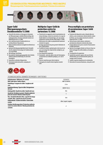 20 WWW.BRENNENSTUHL.COMSTECKDOSENLEISTEN /PROLONGATEURS MULTIPRISES/PRESE MULTIPLE%u00dcberspannungsschutz/ Protection parasurtension et parafoudre/ Protezione da sovratensioneSTECKDOSENLEISTEN /PROLONGATEURS MULTIPRISES/PRESE MULTIPLE%u00dcberspannungsschutz/ Protection parasurtension et parafoudre/ Protezione da sovratensioneSuper-Solid %u00dcberspannungsschutzSteckdosenleiste 13.500AMultiprise Super-Solid de protection contre les surtensions 13.500APresa multipla con protettore di sovratensione Super-Solid 13.500A %u25a0 Schutz f%u00fcr Ihre Ger%u00e4te vor St%u00f6rungen im Stromnetz, wie %u00dcberspannungen, indirekte Blitzeinschl%u00e4ge oder Leitungsrauschen, mit einer maximalen Summe von Ableitstr%u00f6men bis zu 13.500A.%u25a0 Sehr stabil konstruierte Steckdosenleiste aus hochbruchfestem Polycarbonat.%u25a0 Breiter Steckdosenabstand erm%u00f6glicht den Betrieb von Netzteilen.%u25a0 Optimale Befestigungsm%u00f6glichkeit durch Schraubl%u00f6cher f%u00fcr einfache Festmontage der Steckdosenleiste z.B. an der Wand.%u25a0 Mit Aufh%u00e4nge-Vorrichtung.%u25a0 Besonderheit: Kabeleingang gegen%u00fcber dem Schalter, dadurch praktische Bedienung z.B. unter dem Schreibtisch.%u25a0 Gummif%u00fcsse verhindern Wegrutschen.%u25a0 Sicherheitsschalter beleuchtet, zweipolig ein-/ausschaltbar.%u25a0 Protection de vos appareils contre les perturbations du r%u00e9seau %u00e9lectrique, comme les surtensions, les coups de foudre indirects ou le bruit de ligne, avec une somme maximale de courants de fuite allant jusqu%u2019%u00e0 13.500A.%u25a0 B%u00e2ti de prises tr%u00e8s stable en polycarbonate hautement r%u00e9sistant %u00e0 la rupture.%u25a0 Un large espacement des prises permet l%u2019utilisation de blocs d%u2019alimentation.%u25a0 Possibilit%u00e9 de fixation optimale gr%u00e2ce %u00e0 des trous de vis pour un montage fixe simple du bloc multiprises, par exemple au mur.%u25a0 Avec dispositif de suspension.%u25a0 Particularit%u00e9%u00a0: entr%u00e9e de c%u00e2ble en face de l%u2019interrupteur, ce qui permet une utilisation pratique, p. ex. sous le bureau.%u25a0 Pieds en caoutchouc pour %u00e9viter de glisser.%u25a0 Interrupteur de s%u00e9curit%u00e9 %u00e9clair%u00e9, bipolaire marche/arr%u00eat.%u25a0 Protezione dei dispositivi contro i disturbi della rete elettrica, come sovratensioni, fulmini indiretti o disturbi di linea, con una somma massima di correnti di dispersione fino a 13.500A.%u25a0 Striscia di prese molto robusta, realizzata in policarbonato altamente resistente alla rottura.%u25a0 L%u2019ampia distanza tra le prese consente il funzionamento degli alimentatori.%u25a0 Opzione di montaggio ottimale con fori per viti per un facile montaggio fisso della ciabatta, ad esempio a parete.%u25a0 Con dispositivo di sospensione.%u25a0 Caratteristica speciale: ingresso del cavo di fronte all%u2019interruttore, per un funzionamento pratico, ad esempio sotto la scrivania.%u25a0 I piedini in gomma impediscono lo scivolamento.%u25a0 Interruttore di sicurezza illuminato, a due poli on/off.13.500 APROTECTION 2,5m MOUNTABLEMONTIERBARTECHNISCHE DATEN / DONN%u00c9ES TECHNIQUES / DATI TECNICIArtikelnummer/ R%u00e9f%u00e9rence / N%u00b0 articolo 1153342315EAN/ Code-barre / Codice a Barre 4007123184910Kabell%u00e4nge / Longueur de c%u00e2ble / Lunghezza del cavo2.5 mKabelbezeichnung / Type de c%u00e2ble / Designazione del cavo H05VV-F 3G1,5Kabelqualit%u00e4t/ Qualit%u00e9 du c%u00e2ble / Qualit%u00e0 del cavo PVCAnzahl der Steckdosen gesamt/ Nombre global de prises de courant/ Numero totale di prese 5Max. Strombelastbarkeit/ Max. capacit%u00e9 de charge actuelle / Max. capacit%u00e0 di carico di corrente 10 AGeh%u00e4usefarbe / Couleur du bo%u00eetier/ Colore della scatola silber/ argent/ argentoErh%u00f6hter Ber%u00fchrungsschutz/ Protection renforc%u00e9e contre les contacts directs/ Elevata protezione da contatto%uf001