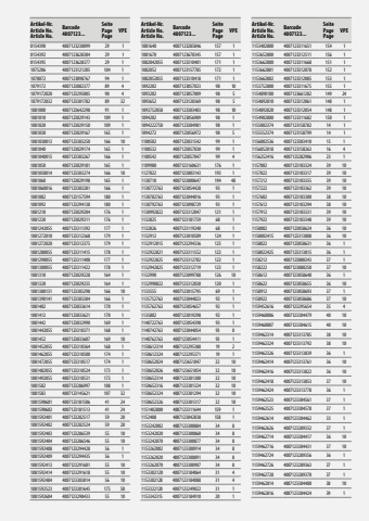 Artikel-Nr. Article No. Article No.Barcode 4007123...Seite Page PageVPE0154390 4007123230099 29 10154392 4007123628384 29 10154395 4007123628377 29 11075206 4007123121205 104 11078072 4007123098767 94 11079172 4007123082377 89 41079172020 4007123295005 90 41079172032 4007123301782 89 321081000 4007123642298 91 11081010 4007123029143 109 11081020 4007123029150 109 11081030 4007123029167 165 11081030013 4007123303250 166 101081040 4007123029174 165 11081040015 4007123303267 166 11081050 4007123029181 165 11081050014 4007123303274 166 101081060 4007123029198 165 11081060016 4007123303281 166 11081082 4007123157594 180 11081092 4007123294138 180 11081210 4007123029204 176 11081220 4007123029211 176 11081242055 4007123311392 177 11081272010 4007123312368 179 11081272020 4007123312375 179 11081280055 4007123311415 178 11081290055 4007123311408 177 11081300055 4007123311422 178 11081310 4007123029228 164 11081320 4007123029235 164 11081380131 4007123303298 166 101081390141 4007123303304 166 11081402 4007123033614 170 11081412 4007123033621 170 11081442 4007123032990 169 11081442055 4007123310371 168 11081452 4007123033607 169 101081452055 4007123310364 168 11081462055 4007123310500 174 11081472055 4007123310517 174 11081482055 4007123310524 173 11081492055 4007123310531 173 11081582 4007123286997 108 11081583 4007123145621 107 321081590601 4007123181506 41 241081590602 4007123181513 41 241081592401 4007123282517 59 201081592402 4007123282524 59 201081592403 4007123286539 55 101081592404 4007123286546 55 101081592408 4007123294428 56 11081592409 4007123294435 56 11081592413 4007123291601 55 101081592414 4007123291618 55 101081592484 4007123303014 56 101081592523 4007123301645 175 501081592604 4007123298433 55 10Artikel-Nr. Article No. Article No.Barcode 4007123...Seite Page PageVPE1081640 4007123285846 157 11081670 4007123670345 157 11082042055 4007123310401 171 11082052 4007123157785 172 11082052055 4007123310418 171 11092202 4007123057023 98 101093202 4007123057009 98 51093652 4007123120369 98 51093752058 4007123303403 98 101094202 4007123056989 98 11094222750 4007123304981 98 11094272 4007123056972 98 51100502 4007123031542 99 11100532 4007123057030 99 11100542 4007123057047 99 41109980 4007123160631 176 11127022 4007123003143 193 11130710 4007123000647 194 481130772763 4007123054428 93 11130782763 4007123044016 93 11130792763 4007123098729 93 11130992822 4007123312047 121 11132825 4007123181759 68 11132826 4007123119240 68 11132912 4007123010509 124 11132912015 4007123294336 125 11132922821 4007123311552 122 11132922825 4007123312702 122 11132942825 4007123312719 123 11132990 4007123099788 126 101132990822 4007123312030 120 11133555 4007123015795 69 11135752763 4007123044023 92 11135762763 4007123054657 92 11135802 4007123019298 92 11140722763 4007123054398 93 11140742763 4007123044054 93 01140762763 4007123054411 93 11150612314 4007123295388 19 21150612324 4007123295371 19 11150652024 4007123651047 32 101150652026 4007123651054 32 101150652314 4007123301300 32 101150652316 4007123301324 32 101150652324 4007123301294 32 101150652326 4007123301317 32 101151402800 4007123311644 159 11152408 4007123042838 158 11153242002 4007123300884 34 81153242020 4007123300860 34 81153242070 4007123300877 34 81153262002 4007123300914 34 81153262020 4007123300891 34 81153262070 4007123300907 34 81153302120 4007123184064 31 41153302128 4007123184088 31 41153322120 4007123249022 31 11153342315 4007123184910 20 1Artikel-Nr. Article No. Article No.Barcode 4007123...Seite Page PageVPE1153402800 4007123311651 154 11153652800 4007123312511 156 11153662800 4007123311668 151 11153662801 4007123312078 152 11153662802 4007123312085 153 11153752800 4007123311675 155 11154890100 4007123661282 149 241154892810 4007123312061 148 11154892820 4007123312054 148 11154902800 4007123311682 150 11155002374 4007123158782 14 11155552374 4007123158799 14 11156002536 4007123303410 15 11156052018 4007123158263 16 41156252416 4007123282906 23 11157002 4007123103324 39 101157022 4007123103317 39 101157212 4007123103355 39 101157222 4007123103362 39 101157602 4007123103300 38 101157612 4007123103294 38 101157912 4007123103331 39 101157922 4007123103348 39 101158002 4007123058624 36 101158002415 4007123313808 36 101158022 4007123058631 36 11158022425 4007123313815 36 11158212 4007123080243 37 11158222 4007123080250 37 101158612 4007123058648 36 11158622 4007123058655 36 101158912 4007123058693 37 11158922 4007123058686 37 101159452616 4007123295654 35 41159460006 4007123304479 40 101159460007 4007123304615 40 101159462314 4007123313785 38 101159462324 4007123313792 38 101159462326 4007123313839 36 11159462414 4007123313761 36 101159462416 4007123313822 36 101159462418 4007123313853 37 101159462424 4007123313778 36 11159462523 4007123304561 37 11159462525 4007123304578 37 11159462614 4007123304462 33 11159462626 4007123289332 37 11159462714 4007123304417 36 101159462716 4007123304431 37 101159462724 4007123289356 36 11159462726 4007123289363 37 11159462728 4007123289370 37 11159462814 4007123304400 38 101159462816 4007123304424 39 1