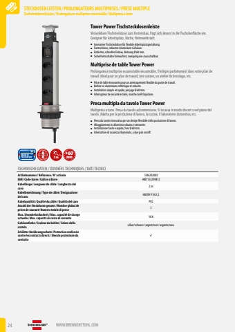 24 WWW.BRENNENSTUHL.COMSTECKDOSENLEISTEN /PROLONGATEURS MULTIPRISES/PRESE MULTIPLETischsteckdosenleisten / Prolongateurs multiprises encastrable/ Multipresa a torreSTECKDOSENLEISTEN /PROLONGATEURS MULTIPRISES/PRESE MULTIPLETischsteckdosenleisten / Prolongateurs multiprises encastrable/ Multipresa a torreTower Power TischsteckdosenleisteVersenkbare Tischsteckdose zum Festeinbau. F%u00fcgt sich dezent in die Tischoberfl%u00e4che ein. Geeignet f%u00fcr Arbeitsplatz, K%u00fcche, Heimwerkstatt.%u25a0 Innovative Tischsteckdose f%u00fcr flexible Arbeitsplatzgestaltung.%u25a0 Formsch%u00f6nes, robustes Aluminium-Geh%u00e4use.%u25a0 Einfacher, schneller Einbau, Bohrung %u00d8 60 mm.%u25a0 Sicherheitsschalter beleuchtet, zweipolig ein-/ausschaltbar.Multiprise de table Tower PowerProlongateur multiprise escamotable encastrable. S%u2019int%u00e8gre parfaitement dans votre plan de travail. Id%u00e9al pour un plan de travail, une cuisine, un atelier de bricolage, etc.%u25a0 Prise de table innovante pour un am%u00e9nagement flexible du poste de travail.%u25a0 Bo%u00eetier en aluminium esth%u00e9tique et robuste.%u25a0 Installation simple et rapide, per%u00e7age %u00d8 60 mm.%u25a0 Interrupteur de s%u00e9curit%u00e9 %u00e9clair%u00e9, marche/arr%u00eat bipolaire.Presa multipla da tavolo Tower PowerMultipresa a torre. Presa da tavolo ad immersione. Si incassa in modo discret o nel piano del tavolo. Adatta per la postazione di lavoro, la cucina, il laboratorio domestico, ecc.%u25a0 Presa da tavolo innovativa per un design flessibile della postazione di lavoro.%u25a0 Alloggiamento in alluminio robusto e attraente.%u25a0 Installazione facile e rapida, foro %u00d8 60 mm.%u25a0 Interruttore di sicurezza illuminato, a due poli on/off.RETRACTABLEVERSENKBAR2m%u00f860mmTECHNISCHE DATEN / DONN%u00c9ES TECHNIQUES / DATI TECNICIArtikelnummer/ R%u00e9f%u00e9rence / N%u00b0 articolo 1396202003EAN/ Code-barre / Codice a Barre 4007123299812Kabell%u00e4nge / Longueur de c%u00e2ble / Lunghezza del cavo2 mKabelbezeichnung / Type de c%u00e2ble / Designazione del cavo H05VV-F 3G1,5Kabelqualit%u00e4t/ Qualit%u00e9 du c%u00e2ble / Qualit%u00e0 del cavo PVCAnzahl der Steckdosen gesamt/ Nombre global de prises de courant/ Numero totale di prese 3Max. Strombelastbarkeit/ Max. capacit%u00e9 de charge actuelle / Max. capacit%u00e0 di carico di corrente 10 AGeh%u00e4usefarbe / Couleur du bo%u00eetier/ Colore della scatola silber/schwarz/ argent/noir/ argento/neroErh%u00f6hter Ber%u00fchrungsschutz/ Protection renforc%u00e9e contre les contacts directs/ Elevata protezione da contatto%uf001