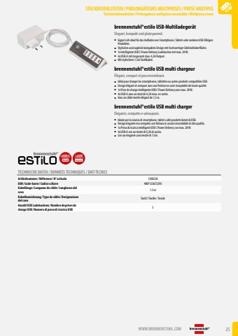 WWW.BRENNENSTUHL.COM 25STECKDOSENLEISTEN /PROLONGATEURS MULTIPRISES/PRESE MULTIPLETischsteckdosenleisten / Prolongateurs multiprises encastrable/ Multipresa a torreSTECKDOSENLEISTEN /PROLONGATEURS MULTIPRISES/PRESE MULTIPLETischsteckdosenleisten / Prolongateurs multiprises encastrable/ Multipresa a torrebrennenstuhl%u00aeestilo USB-Multiladeger%u00e4tElegant, kompakt und platzsparend.%u25a0 Eignet sich ideal f%u00fcr das Aufladen von Smartphones, Tablets oder anderen USB-f%u00e4higen Produkten. %u25a0 Stylisches und zugleich kompaktes Design mit hochwertiger Edelstahloberfl%u00e4che. %u25a0 1x Intelligente USB C Power Delivery Ladebuchse mit max. 20 W. %u25a0 4x USB-A mit insgesamt max. 4,2A Output.%u25a0 Mit stylischem 1,5m Textilkabel.brennenstuhl%u00aeestilo USB multi chargeur%u00c9l%u00e9gant, compact et peu encombrant.%u25a0 Id%u00e9al pour charger les smartphones, tablettes ou autres produits compatibles USB. %u25a0 Design %u00e9l%u00e9gant et compact avec une finition en acier inoxydable de haute qualit%u00e9. %u25a0 1x Prise de charge intelligente USB C Power Delivery avec max. 20 W. %u25a0 4x USB-A avec un total de 4,2A max. en sortie.%u25a0 Avec un c%u00e2ble textile %u00e9l%u00e9gant de 1,5 m.brennenstuhl%u00aeestilo USB multi chargerElegante, compatto e salvaspazio.%u25a0 Ideale per la ricarica di smartphone, tablet o altri prodotti dotati di USB. %u25a0 Design elegante ma compatto con finitura in acciaio inossidabile di alta qualit%u00e0. %u25a0 1x Presa di ricarica Intelligent USB C Power Delivery con max. 20 W. %u25a0 4x USB-A con un totale di 4,2A di uscita.%u25a0 Con un elegante cavo tessile di 1.5m.TECHNISCHE DATEN / DONN%u00c9ES TECHNIQUES / DATI TECNICIArtikelnummer/ R%u00e9f%u00e9rence / N%u00b0 articolo 1508230EAN/ Code-barre / Codice a Barre 4007123672295Kabell%u00e4nge / Longueur de c%u00e2ble / Lunghezza del cavo1.5 mKabelbezeichnung / Type de c%u00e2ble / Designazione del cavoTextil / Textile / TessileAnzahl USB Ladebuchsen / Nombre de prises de charge USB / Numero di prese di ricarica USB 5
