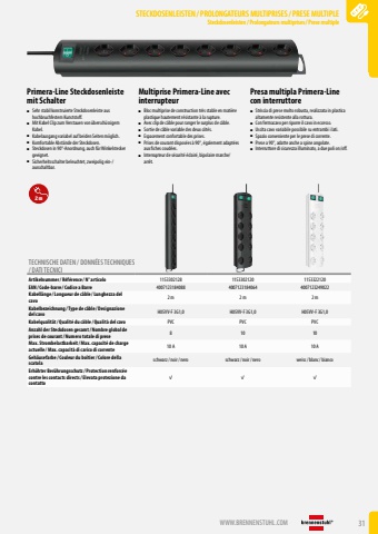 WWW.BRENNENSTUHL.COM 31STECKDOSENLEISTEN /PROLONGATEURS MULTIPRISES/PRESE MULTIPLESteckdosenleisten / Prolongateurs multiprises/ Prese multipleSTECKDOSENLEISTEN /PROLONGATEURS MULTIPRISES/PRESE MULTIPLESteckdosenleisten / Prolongateurs multiprises/ Prese multiplePrimera-Line Steckdosenleiste mit SchalterMultiprise Primera-Line avec interrupteurPresa multipla Primera-Line con interruttore %u25a0 Sehr stabil konstruierte Steckdosenleiste aus hochbruchfestem Kunststoff.%u25a0 Mit Kabel Clip zum Verstauen von %u00fcbersch%u00fcssigem Kabel.%u25a0 Kabelausgang variabel auf beiden Seiten m%u00f6glich.%u25a0 Komfortable Abst%u00e4nde der Steckdosen.%u25a0 Steckdosen in 90%u00b0-Anordnung, auch f%u00fcr Winkelstecker geeignet.%u25a0 Sicherheitsschalter beleuchtet, zweipolig ein-/ausschaltbar.%u25a0 Bloc multiprise de construction tr%u00e8s stable en mati%u00e8re plastique hautement r%u00e9sistante %u00e0 la rupture.%u25a0 Avec clip de c%u00e2ble pour ranger le surplus de c%u00e2ble.%u25a0 Sortie de c%u00e2ble variable des deux c%u00f4t%u00e9s.%u25a0 Espacement confortable des prises.%u25a0 Prises de courant dispos%u00e9es %u00e0 90%u00b0, %u00e9galement adapt%u00e9es aux fiches coud%u00e9es.%u25a0 Interrupteur de s%u00e9curit%u00e9 %u00e9clair%u00e9, bipolaire marche/arr%u00eat.%u25a0 Striscia di prese molto robusta, realizzata in plastica altamente resistente alla rottura.%u25a0 Con fermacavo per riporre il cavo in eccesso.%u25a0 Uscita cavo variabile possibile su entrambi i lati.%u25a0 Spazio conveniente per le prese di corrente.%u25a0 Prese a 90%u00b0, adatte anche a spine angolate.%u25a0 Interruttore di sicurezza illuminato, a due poli on/off.2mTECHNISCHE DATEN / DONN%u00c9ES TECHNIQUES / DATI TECNICIArtikelnummer/ R%u00e9f%u00e9rence / N%u00b0 articolo 1153302128 1153302120 1153322120EAN/ Code-barre / Codice a Barre 4007123184088 4007123184064 4007123249022Kabell%u00e4nge / Longueur de c%u00e2ble / Lunghezza del cavo2 m 2 m 2 mKabelbezeichnung / Type de c%u00e2ble / Designazione del cavo H05VV-F 3G1,0 H05VV-F 3G1,0 H05VV-F 3G1,0Kabelqualit%u00e4t/ Qualit%u00e9 du c%u00e2ble / Qualit%u00e0 del cavo PVC PVC PVCAnzahl der Steckdosen gesamt/ Nombre global de prises de courant/ Numero totale di prese 8 10 10Max. Strombelastbarkeit/ Max. capacit%u00e9 de charge actuelle / Max. capacit%u00e0 di carico di corrente 10 A 10 A 10 AGeh%u00e4usefarbe / Couleur du bo%u00eetier/ Colore della scatola schwarz/ noir/ nero schwarz/ noir/ nero weiss/ blanc/ biancoErh%u00f6hter Ber%u00fchrungsschutz/ Protection renforc%u00e9e contre les contacts directs/ Elevata protezione da contatto%uf001 %uf001 %uf001