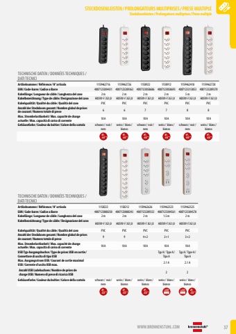 WWW.BRENNENSTUHL.COM 37STECKDOSENLEISTEN /PROLONGATEURS MULTIPRISES/PRESE MULTIPLESteckdosenleisten / Prolongateurs multiprises/ Prese multipleSTECKDOSENLEISTEN /PROLONGATEURS MULTIPRISES/PRESE MULTIPLESteckdosenleisten / Prolongateurs multiprises/ Prese multipleTECHNISCHE DATEN / DONN%u00c9ES TECHNIQUES / DATI TECNICIArtikelnummer/ R%u00e9f%u00e9rence / N%u00b0 articolo 1159462716 1159462726 1158922 1158912 1159462418 1159462728EAN/ Code-barre / Codice a Barre 4007123304431 4007123289363 4007123058686 4007123058693 4007123313853 4007123289370Kabell%u00e4nge / Longueur de c%u00e2ble / Lunghezza del cavo 2 m 2 m 2 m 2 m 5 m 2 mKabelbezeichnung / Type de c%u00e2ble / Designazione del cavo H05VV-F 3G1,0 H05VV-F 3G1,0 H05VV-F 3G1,0 H05VV-F 3G1,0 H05VV-F 3G1,0 H05VV-F 3G1,0Kabelqualit%u00e4t/ Qualit%u00e9 du c%u00e2ble / Qualit%u00e0 del cavo PVC PVC PVC PVC PVC PVCAnzahl der Steckdosen gesamt/ Nombre global de prises de courant/ Numero totale di prese 6 6 7 7 8 8Max. Strombelastbarkeit/ Max. capacit%u00e9 de charge actuelle / Max. capacit%u00e0 di carico di corrente 10 A 10 A 10 A 10 A 10 A 10 AGeh%u00e4usefarbe / Couleur du bo%u00eetier/ Colore della scatola schwarz/ noir/neroweiss/ blanc/biancoschwarz/ noir/neroweiss/ blanc/biancoschwarz/ noir/neroweiss/ blanc/bianco2m 2m 2m 2m 5m 2mTECHNISCHE DATEN / DONN%u00c9ES TECHNIQUES / DATI TECNICIArtikelnummer/ R%u00e9f%u00e9rence / N%u00b0 articolo 1158222 1158212 1159462626 1159462523 1159462525EAN/ Code-barre / Codice a Barre 4007123080250 4007123080243 4007123289332 4007123304561 4007123304578Kabell%u00e4nge / Longueur de c%u00e2ble / Lunghezza del cavo 2 m 2 m 2 m 1.5 m 2 mKabelbezeichnung / Type de c%u00e2ble / Designazione del cavo H05VV-F 3G1,0 H05VV-F 3G1,0 H05VV-F 3G1,0 H05VV-F 3G1,0 H05VV-F 3G1,0Kabelqualit%u00e4t/ Qualit%u00e9 du c%u00e2ble / Qualit%u00e0 del cavo PVC PVC PVC PVC PVCAnzahl der Steckdosen gesamt/ Nombre global de prises de courant/ Numero totale di prese 9 9 4+2 2+1 3+2Max. Strombelastbarkeit/ Max. capacit%u00e9 de charge actuelle / Max. capacit%u00e0 di carico di corrente 10 A 10 A 10 A 10 A 10 AUSB Typ-Ausgangsbuchse / Type de prises USB en sortie / Connettore di uscita di tipo USBTyp A / Type A /Tipo ATyp A / Type A /Tipo AMax. Ausgangsstrom USB / Courant de sortie maximal USB / Corrente d%u2019uscita USB max. 2.1 A 2.1 AAnzahl USB Ladebuchsen / Nombre de prises de charge USB / Numero di prese di ricarica USB 2 2 Geh%u00e4usefarbe / Couleur du bo%u00eetier/ Colore della scatola schwarz/ noir/neroweiss/ blanc/biancoweiss/ blanc/biancoweiss/ blanc/biancoweiss/ blanc/bianco2m 2m 2m 2m