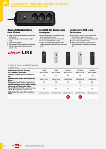 38 WWW.BRENNENSTUHL.COMSTECKDOSENLEISTEN /PROLONGATEURS MULTIPRISES/PRESE MULTIPLESteckdosenleisten / Prolongateurs multiprises/ Prese multipleSTECKDOSENLEISTEN /PROLONGATEURS MULTIPRISES/PRESE MULTIPLESteckdosenleisten / Prolongateurs multiprises/ Prese multiplecleverLINE Steckdosenleiste ohne SchaltercleverLINE B%u00e2ti de prises sans interrupteurciabatta cleverLINE senza interruttore %u25a0 Stabile, formsch%u00f6ne Kompaktleiste aus hochbruchfestem Kunststoff.%u25a0 Elegantes, schlankes, zeitloses und hochwertiges Design.%u25a0 Mit Reset Sicherungstaste.%u25a0 Halterung zum einfachen Befestigen an W%u00e4nden und M%u00f6beln mit Magnet und Anschraubvorrichtung (Zubeh%u00f6r S. 40).%u25a0 Barre compacte stable et esth%u00e9tique en plastique hautement r%u00e9sistant %u00e0 la rupture.%u25a0 Design %u00e9l%u00e9gant, %u00e9lanc%u00e9, intemporel et de qualit%u00e9.%u25a0 Avec bouton de r%u00e9initialisation du fusible.%u25a0 Support pour une fixation facile aux murs et aux meubles avec aimant et dispositif %u00e0 visser (Accessoires p. 40)%u25a0 Barra compatta, robusta e sagomata, realizzata in plastica altamente resistente alla rottura.%u25a0 Design elegante, sottile, senza tempo e di alta qualit%u00e0.%u25a0 Con pulsante di sicurezza di ripristino.%u25a0 Staffa per un facile fissaggio a pareti e mobili con magnete e dispositivo di avvitamento (Accessori p. 40).TECHNISCHE DATEN / DONN%u00c9ES TECHNIQUES / DATI TECNICIArtikelnummer/ R%u00e9f%u00e9rence / N%u00b0 articolo 1157602 1157612 1159462314 1159462324 1159462814EAN/ Code-barre / Codice a Barre 4007123103300 4007123103294 4007123313785 4007123313792 4007123304400Kabell%u00e4nge / Longueur de c%u00e2ble / Lunghezza del cavo1.5 m 1.5 m 3 m 3 m 1.5 mKabelbezeichnung / Type de c%u00e2ble / Designazione del cavo H05VV-F 3G1,0 H05VV-F 3G1,0 H05VV-F 3G1,0 H05VV-F 3G1,0 H05VV-F 3G1,0Kabelqualit%u00e4t/ Qualit%u00e9 du c%u00e2ble / Qualit%u00e0 del cavo PVC PVC PVC PVC PVCAnzahl der Steckdosen gesamt/ Nombre global de prises de courant/ Numero totale di prese 3 3 4 4 4Max. Strombelastbarkeit/ Max. capacit%u00e9 de charge actuelle / Max. capacit%u00e0 di carico di corrente 10 A 10 A 10 A 10 A 10 AGeh%u00e4usefarbe / Couleur du bo%u00eetier/ Colore della scatola schwarz/ noir/ nero weiss/ blanc/ bianco schwarz/ noir/ nero weiss/ blanc/ bianco schwarz/ noir/ nero3m 3m