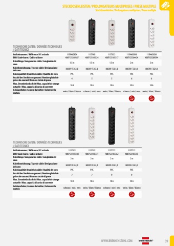 WWW.BRENNENSTUHL.COM 39STECKDOSENLEISTEN /PROLONGATEURS MULTIPRISES/PRESE MULTIPLESteckdosenleisten / Prolongateurs multiprises/ Prese multipleSTECKDOSENLEISTEN /PROLONGATEURS MULTIPRISES/PRESE MULTIPLESteckdosenleisten / Prolongateurs multiprises/ Prese multipleTECHNISCHE DATEN / DONN%u00c9ES TECHNIQUES / DATI TECNICIArtikelnummer/ R%u00e9f%u00e9rence / N%u00b0 articolo 1159462824 1157002 1157022 1159462816 1159462826EAN/ Code-barre / Codice a Barre 4007123289387 4007123103324 4007123103317 4007123304424 4007123289394Kabell%u00e4nge / Longueur de c%u00e2ble / Lunghezza del cavo1.5 m 1.5 m 1.5 m 2 m 2 mKabelbezeichnung / Type de c%u00e2ble / Designazione del cavo H05VV-F 3G1,0 H05VV-F 3G1,0 H05VV-F 3G1,0 H05VV-F 3G1,0 H05VV-F 3G1,0Kabelqualit%u00e4t/ Qualit%u00e9 du c%u00e2ble / Qualit%u00e0 del cavo PVC PVC PVC PVC PVCAnzahl der Steckdosen gesamt/ Nombre global de prises de courant/ Numero totale di prese 4 5 5 6 6Max. Strombelastbarkeit/ Max. capacit%u00e9 de charge actuelle / Max. capacit%u00e0 di carico di corrente 10 A 10 A 10 A 10 A 10 AGeh%u00e4usefarbe / Couleur du bo%u00eetier/ Colore della scatola weiss/ blanc/ bianco schwarz/ noir/ nero weiss/ blanc/ bianco schwarz/ noir/ nero weiss/ blanc/ bianco2m 2mTECHNISCHE DATEN / DONN%u00c9ES TECHNIQUES / DATI TECNICIArtikelnummer/ R%u00e9f%u00e9rence / N%u00b0 articolo 1157922 1157912 1157222 1157212EAN/ Code-barre / Codice a Barre 4007123103348 4007123103331 4007123103362 4007123103355Kabell%u00e4nge / Longueur de c%u00e2ble / Lunghezza del cavo2 m 2 m 2 m 2 mKabelbezeichnung / Type de c%u00e2ble / Designazione del cavo H05VV-F 3G1,0 H05VV-F 3G1,0 H05VV-F 3G1,0 H05VV-F 3G1,0Kabelqualit%u00e4t/ Qualit%u00e9 du c%u00e2ble / Qualit%u00e0 del cavo PVC PVC PVC PVCAnzahl der Steckdosen gesamt/ Nombre global de prises de courant/ Numero totale di prese 7 7 9 9Max. Strombelastbarkeit/ Max. capacit%u00e9 de charge actuelle / Max. capacit%u00e0 di carico di corrente 10 A 10 A 10 A 10 AGeh%u00e4usefarbe / Couleur du bo%u00eetier/ Colore della scatola schwarz/ noir/ nero weiss/ blanc/ bianco schwarz/ noir/ nero weiss/ blanc/ bianco2m 2m 2m 2m