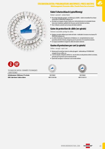 WWW.BRENNENSTUHL.COM 41STECKDOSENLEISTEN /PROLONGATEURS MULTIPRISES/PRESE MULTIPLEKabelmanagement/ Accessoires c%u00e2bles/ Fascette Ferma Cavo ed accessoriSTECKDOSENLEISTEN /PROLONGATEURS MULTIPRISES/PRESE MULTIPLEKabelmanagement/ Accessoires c%u00e2bles/ Fascette Ferma Cavo ed accessoriSTECKDOSENLEISTEN /PROLONGATEURS MULTIPRISES/PRESE MULTIPLEKabelmanagement/ Accessoires c%u00e2bles/ Fascette Ferma Cavo ed accessoriKabel-Schutzschlauch (spiralf%u00f6rmig)Ordnet- sammelt - sch%u00fctzt Kabel%u25a0 Nur wenige Sekunden gen%u00fcgen, um Ordnung zu schaffen - wieder verwendbar f%u00fcr zu Hause und im B%u00fcro TV/VIDEO/HiFi/Computer usw.%u25a0 Die Kabel von Computer, Drucker, Telefon usw. sind normalerweise ein verstaubter Knoten hinter dem Schreibtisch, gef%u00e4hrlich f%u00fcr Personen und die Sicherheit von Daten.%u25a0 Diese Schl%u00e4uche sammeln und verstauen die Kabel ordentlich.Gaine de protection de c%u00e2ble (en spirale)Ordonne-rassemble-prot%u00e8ge les c%u00e2bles%u25a0 Quelques secondes suffisent pour mettre de l%u2019ordre - r%u00e9utilisable %u00e0 la maison et au bureau TV/VIDEO/HiFi/ordinateur etc.%u25a0 Les c%u00e2bles d%u2019ordinateur, d%u2019imprimante, de t%u00e9l%u00e9phone, etc. sont g%u00e9n%u00e9ralement un n%u0153ud poussi%u00e9reux derri%u00e8re le bureau, dangereux pour les personnes et la s%u00e9curit%u00e9 des donn%u00e9es.%u25a0 Ces tuyaux rassemblent et rangent les c%u00e2bles de mani%u00e8re ordonn%u00e9e.Guaina di protezione per cavi (a spirale)Ordina - raccogli - copri i cavi%u25a0 Bastano pochi secondi per tenere in ordine gli oggetti - riutilizzabile per TV/VIDEO/HiFi/computer di casa e ufficio, ecc.%u25a0 I cavi di computer, stampanti, telefoni ecc. sono di solito un nodo polveroso dietro la scrivania, pericoloso per le persone e per la sicurezza dei dati.%u25a0 Questi tubi raccolgono e conservano i cavi in modo ordinato.3m%u00f820mmTECHNISCHE DATEN / DONN%u00c9ES TECHNIQUES / DATI TECNICIArtikelnummer/ R%u00e9f%u00e9rence / N%u00b0 articolo 1081590601 1081590602EAN/ Code-barre / Codice a Barre 4007123181506 4007123181513