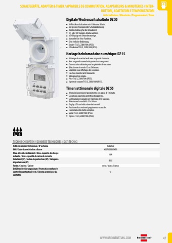 WWW.BRENNENSTUHL.COM 47SCHALTGER%u00c4TE, ADAPTER & TIMER / APPAREILS DE COMMUTATION, ADAPTATEURS & MINUTERIES/INTERRUTTORI, ADATTATORI E TEMPORIZZATORIZeitschaltuhren / Minuteries/ Programmatori / TimerSCHALTGER%u00c4TE, ADAPTER & TIMER / APPAREILS DE COMMUTATION, ADAPTATEURS & MINUTERIES/INTERRUTTORI, ADATTATORI E TEMPORIZZATORIZeitschaltuhren / Minuteries/ Programmatori / TimerDigitale Wochenzeitschaltuhr DZ 55%u25a0 10 Ein-/Ausschaltzeiten mit 1 Minuten Schritt.%u25a0 Mit grosser, transparenter Schutzabdeckung.%u25a0 Zufallsschaltung f%u00fcr die Urlaubszeit.%u25a0 12- oder 24-Stunden-Modus w%u00e4hlen.%u25a0 LCD-Display mit Sekundenanzeige.%u25a0 Manuelle Ein-/Aus-Funktion.%u25a0 Sehr einfache Bedienung.%u25a0 Stecker T13/3, 230V/10A (IP55).%u25a0 1 Steckdose T13/3, 230V/10A (IP55).Horloge hebdomadaire num%u00e9rique DZ 55%u25a0 10 temps de marche/arr%u00eat avec un pas de 1 minute.%u25a0 Avec un grand couvercle de protection transparent.%u25a0 Commutation al%u00e9atoire pour les p%u00e9riodes de vacances.%u25a0 S%u00e9lectionner le mode 12 ou 24 heures.%u25a0 %u00c9cran LCD avec affichage des secondes.%u25a0 Fonction marche/arr%u00eat manuelle.%u25a0 Utilisation tr%u00e8s simple.%u25a0 Prise T13/3, 230V/10A (IP55).%u25a0 1 prise de courant T13/3, 230V/10A (IP55).Timer settimanale digitale DZ 55%u25a0 10 orari di accensione/spegnimento con passo di 1 minuto.%u25a0 Con ampio coperchio protettivo trasparente.%u25a0 Commutazione casuale per il periodo delle vacanze.%u25a0 Selezionare la modalit%u00e0 12 o 24 ore.%u25a0 Display LCD con indicazione dei secondi.%u25a0 Funzione di accensione/spegnimento manuale.%u25a0 Funzionamento molto semplice.%u25a0 Spina T13/3, 230V/10A (IP55).%u25a0 1 presa T13/3, 230V/10A (IP55).TECHNISCHE DATEN / DONN%u00c9ES TECHNIQUES / DATI TECNICIArtikelnummer/ R%u00e9f%u00e9rence / N%u00b0 articolo 1506152EAN/ Code-barre / Codice a Barre 4007123312450Max. Strombelastbarkeit/ Max. capacit%u00e9 de charge actuelle / Max. capacit%u00e0 di carico di corrente 10 ASchutzart (IP)/ Indice de protection (IP)/ Categoria di protezione (IP) IP55Farbe / Couleur/ Colore weiss/ blanc/ biancoErh%u00f6hter Ber%u00fchrungsschutz/ Protection renforc%u00e9e contre les contacts directs/ Elevata protezione da contatto%uf001
