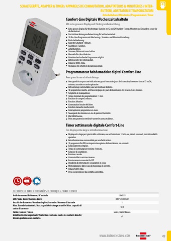 WWW.BRENNENSTUHL.COM 49SCHALTGER%u00c4TE, ADAPTER & TIMER / APPAREILS DE COMMUTATION, ADAPTATEURS & MINUTERIES/INTERRUTTORI, ADATTATORI E TEMPORIZZATORIZeitschaltuhren / Minuteries/ Programmatori / TimerSCHALTGER%u00c4TE, ADAPTER & TIMER / APPAREILS DE COMMUTATION, ADAPTATEURS & MINUTERIES/INTERRUTTORI, ADATTATORI E TEMPORIZZATORIZeitschaltuhren / Minuteries/ Programmatori / TimerComfort-Line Digitale WochenzeitschaltuhrMit extra grossem Display und Hintergrundbeleuchtung.%u25a0 Extra grosses Display f%u00fcr Wochentage, Stunden im 12 und 24 Stunden-Format, Minuten und Sekunden, sowie f%u00fcr die Betriebsart.%u25a0 Zuschaltbare Hintergrundbeleuchtung f%u00fcr leichte Lesbarkeit.%u25a0 10 Ein-/Aus-Programme mit Wochentag-, Stunden- und Minuten-Einstellung.%u25a0 Einfache Bedienung.%u25a0 K%u00fcrzeste Schaltzeit 1 Minute.%u25a0 Countdown-Funktion.%u25a0 Zufallsfunktion.%u25a0 Sommer-/Winterzeit umschaltbar.%u25a0 Manuelle Ein-/Aus-Funktion.%u25a0 Unterbrechen laufender Programme m%u00f6glich.%u25a0 Datenspeicher bei Stromausfall.%u25a0 Inklusive NiMH-Akku.%u25a0 Steckdose mit erh%u00f6htem Ber%u00fchrungsschutz.Programmateur hebdomadaire digital Comfort-LineAvec grand %u00e9cran et r%u00e9tro%u00e9clairage.%u25a0 Avec grand %u00e9cran pour une indication en grand format des jours de la semaine, heures en format 12 ou 24, minutes, secondes et mode op%u00e9ratoire.%u25a0 R%u00e9tro%u00e9clairage commutable pour une meilleure lisibilit%u00e9.%u25a0 10 programmes marche-arr%u00eat avec r%u00e9glage des jours de la semaine, des heures et des minutes.%u25a0 Simplicit%u00e9 de manipulation.%u25a0 Temps minimum de programmation%u00a0: 1 min.%u25a0 Fonction de compte %u00e0 rebours.%u25a0 Fonction al%u00e9atoire.%u25a0 Commutation horaire %u00e9t%u00e9/hiver.%u25a0 Fonction manuelle marche/arr%u00eat.%u25a0 Interruption de programmes en cours.%u25a0 Sauvegarde des donn%u00e9es en cas de panne d%u2019%u00e9lectricit%u00e9.%u25a0 Pile NiMH fournie.%u25a0 Prise avec protection renforc%u00e9e contre les contacts directs.Timer settimanale digitale Comfort-LineCon display extra large e retroilluminazione.%u25a0 Display extra large per i giorni della settimana, ore nel formato da 12 e 24 ore, minuti e secondi, nonch%u00e9 modalit%u00e0 operativa.%u25a0 Retroilluminazione commutabile per una facile lettura.%u25a0 10 programmi On/Off con impostazione giorno della settimana, ore e minuti.%u25a0 Funzionamento semplice.%u25a0 Tempo di commutazione minimo 1 minuto.%u25a0 Funzione di countdown.%u25a0 Funzione casuale.%u25a0 Commutabile tra estate e inverno.%u25a0 Funzionamento manuale On/Off.%u25a0 Possibilit%u00e0 di interrompere i programmi in corso.%u25a0 Memorizzazione dati in caso di mancanza di corrente.%u25a0 Incluso NiMH-Akku.%u25a0 Presa con protezione da contatto aumentata.NiMHINCLUSIVETECHNISCHE DATEN / DONN%u00c9ES TECHNIQUES / DATI TECNICIArtikelnummer/ R%u00e9f%u00e9rence / N%u00b0 articolo 1506322EAN/ Code-barre / Codice a Barre 4007123303502Anzahl der Batterien / Nombre de piles/ batteries/ Numero di batterie 1Max. Strombelastbarkeit/ Max. capacit%u00e9 de charge actuelle / Max. capacit%u00e0 di carico di corrente 10 AFarbe / Couleur/ Colore weiss/ blanc/ biancoErh%u00f6hter Ber%u00fchrungsschutz/ Protection renforc%u00e9e contre les contacts directs/ Elevata protezione da contatto %uf001